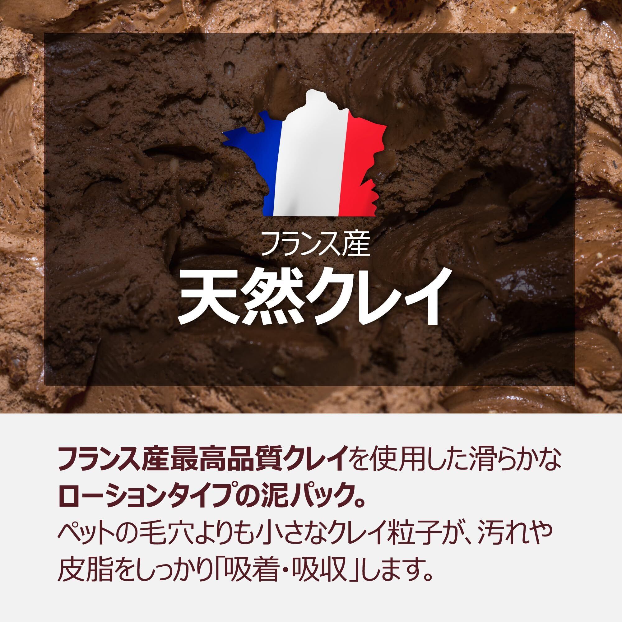 【フランス産クレイ】 スキンケア先進国・フランス産の高品質クレイを贅沢に使用した、ローションタイプのペット用泥パックです。超微粒子のクレイが、ペットの毛穴よりも小さなサイズで肌に密着し、毛穴の奥に潜む皮脂や老廃物、汚れをしっかり吸着・除去。皮膚をすこやかに整え、清潔で美しい毛並みへと導きます。
