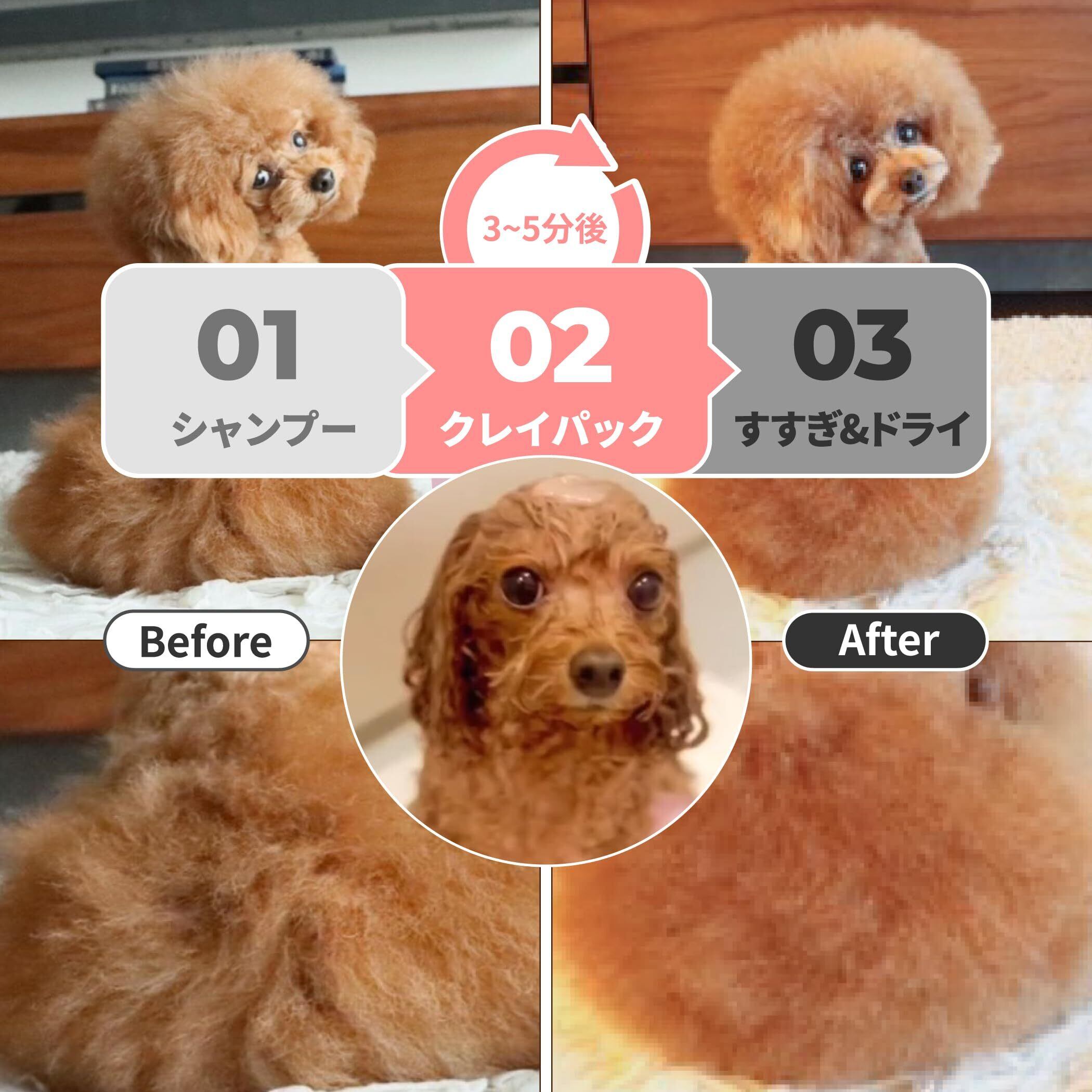 【2度洗い不要で時短ケア】 塗布後3〜5分程度マッサージをして、ぬるま湯で洗い流すだけでケアが完了。 再度のシャンプーは不要のため、 施術の手間を大幅に削減でき、ペットへのストレスも軽減します。 ご家庭でのデイリーケアはもちろん、トリミングサロンや動物病院など業務用途でも効率的にご使用いただけます。