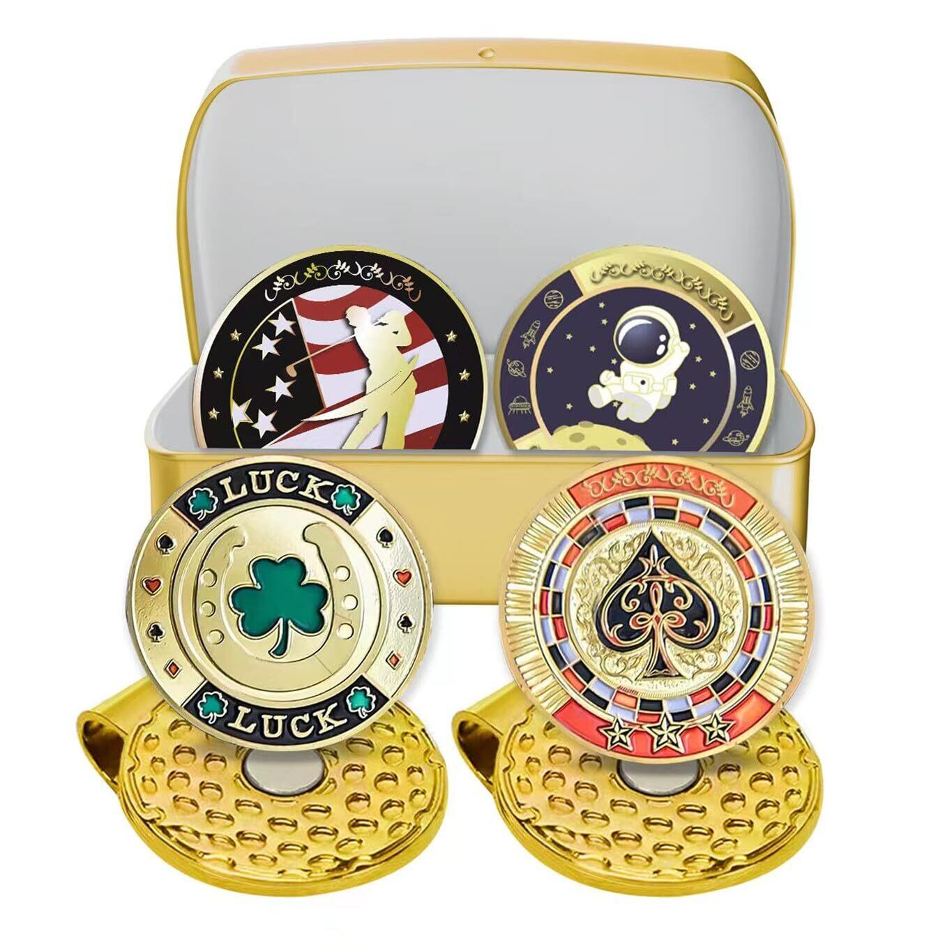 4.各小包にはゴルフキャップ2つとゴルフマーク4つとゴールドの金属ケース1つが含まれています。