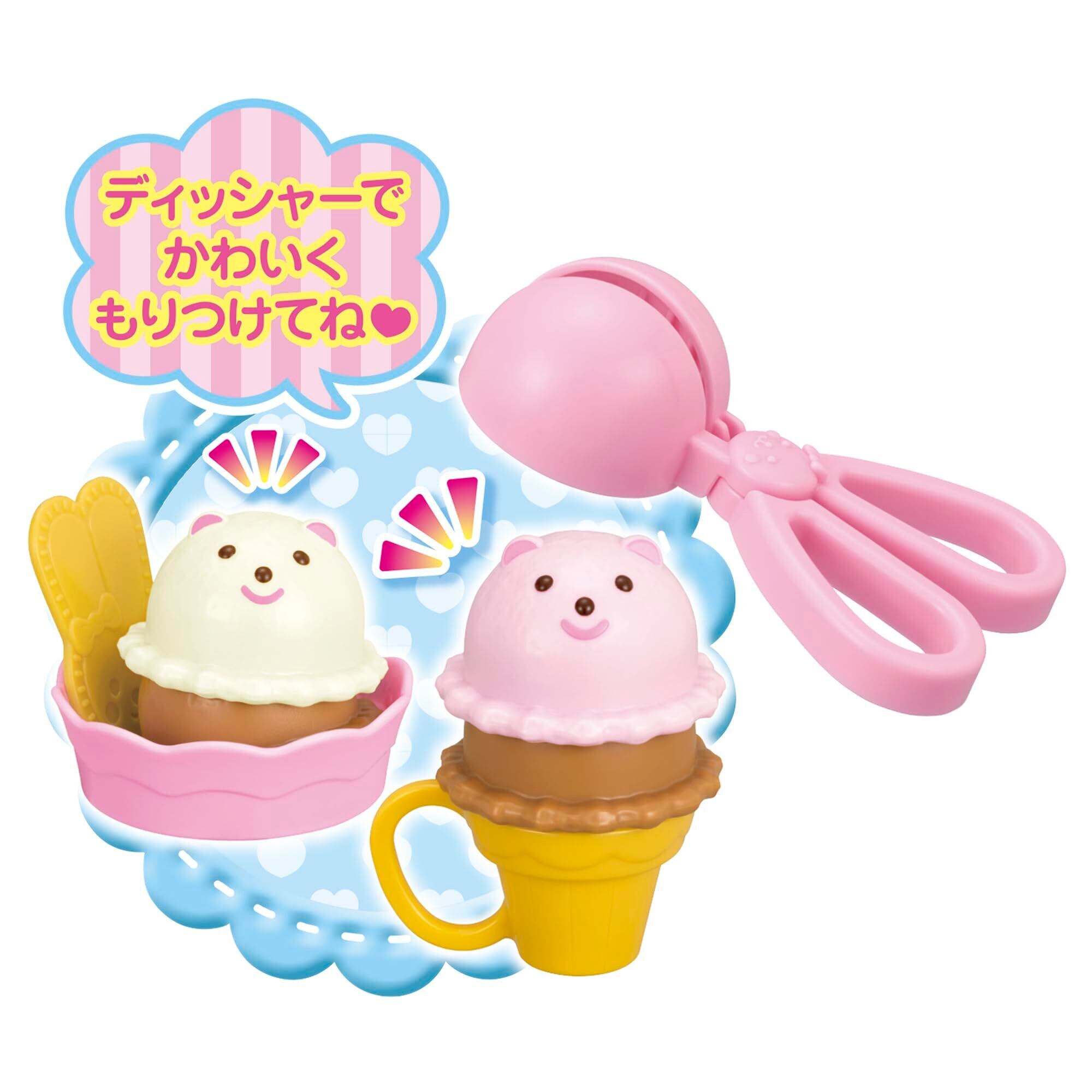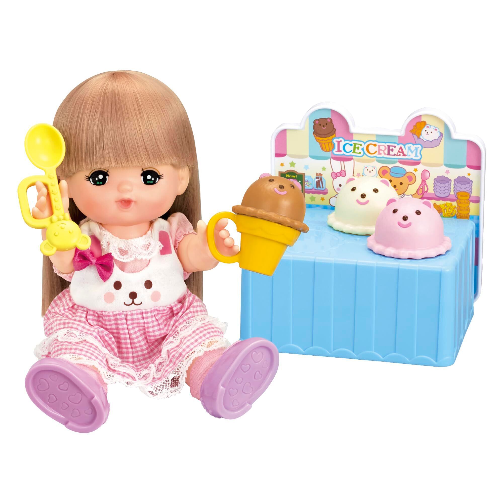 ・メルちゃんとアイスやさんごっこしよう! ・対象年齢:3才以上 ・セット内容:ケース&ふた、ディッシャー、カップ、コーン、スプーン、ウエハース、アイス×3