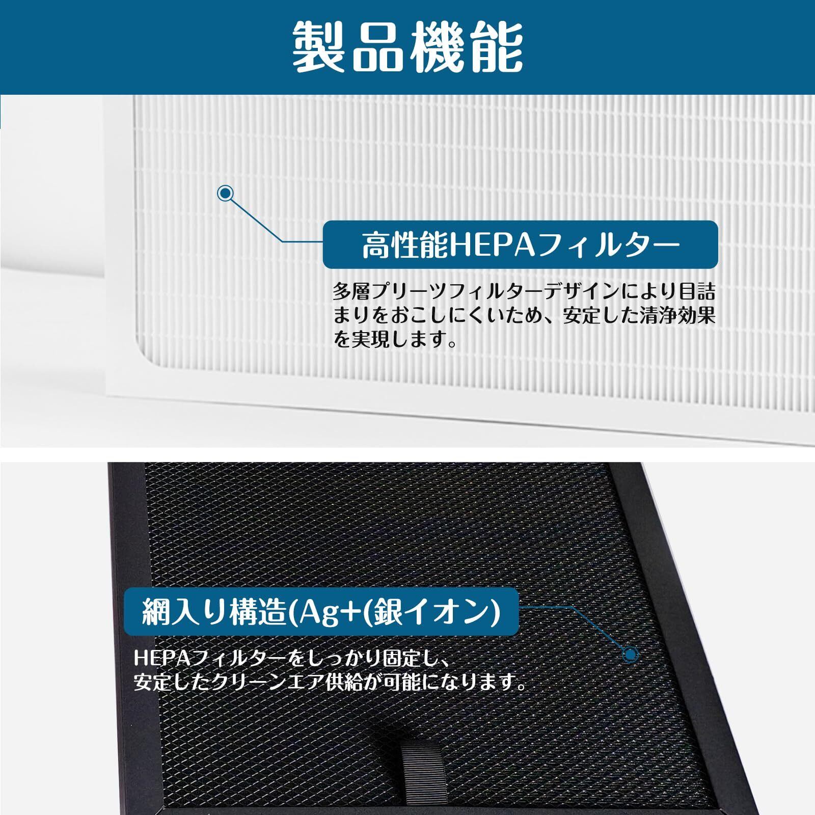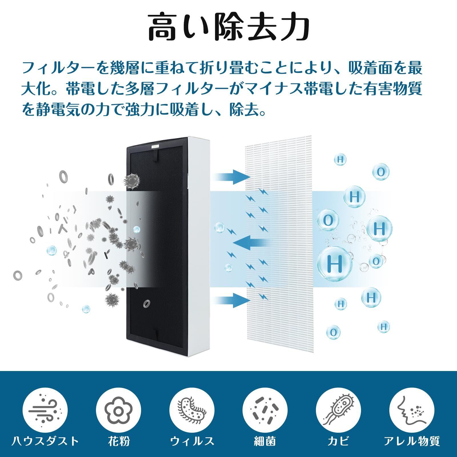 【高性能フィルター】0.1μmまでの有害物質を99.97%除去。空気中に漂うホコリや花粉、マイクロプラスチックなど、様々な有害物質を速く確実に除去します。独自技術により目詰まりをおこしにくいため、安定した清浄効果を実現します。