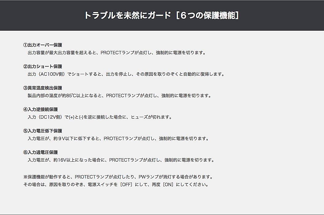 入力電圧:DC12V(動作電圧範囲12.0V~14.5V) 出力電圧:AC100V