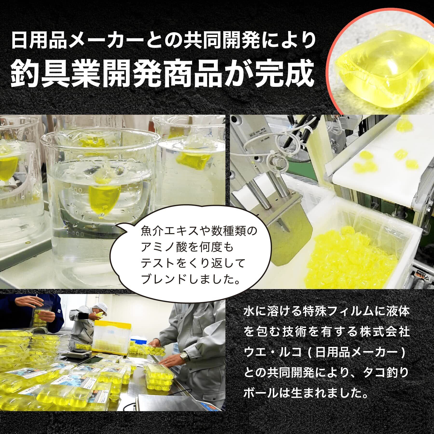 【タコ釣りボール】独自ブレンドのタコ寄せエキス「パックアミンW」 タコが好む魚介エキスや数種類のアミノ酸を凝縮した成分を配合したオリジナルエキスを開発。