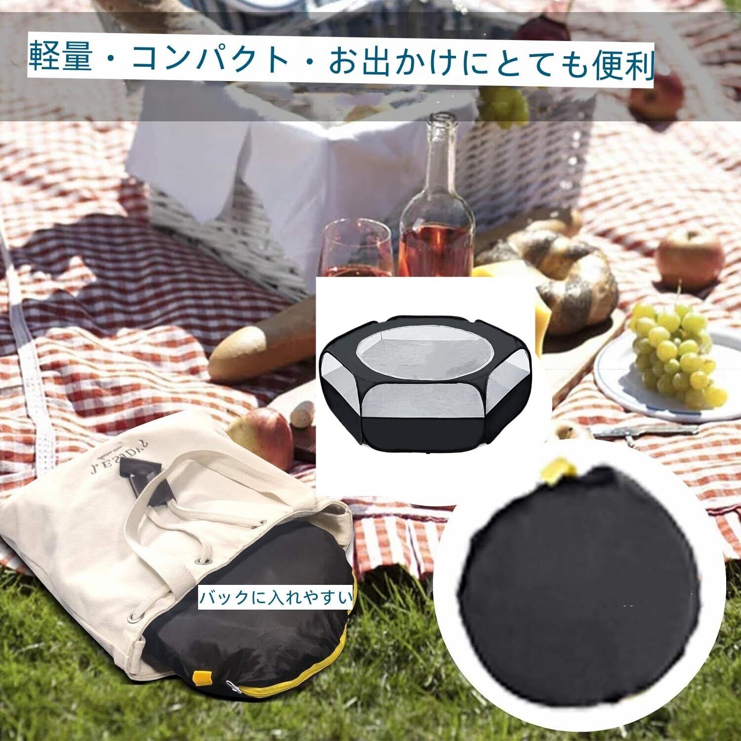 1.【製品仕様】ペットサークル本体+収納袋+固定棒3本付き、サイズ:[展開の時]約 120cm×38cm [収納の時] 約24×23×3cm、カラー:ブラック、素材:オックスフォード布+メッシュ素材。