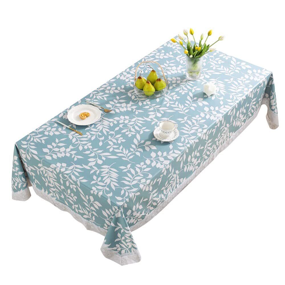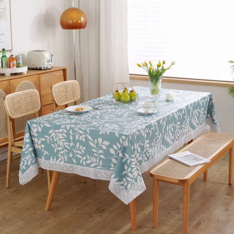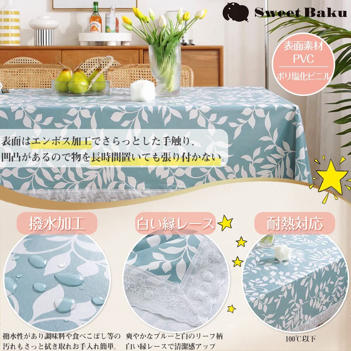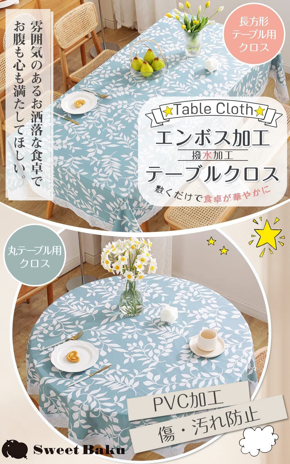 【特徴】撥水加工のテーブルクロスです。表面はエンボス加工でさらっと手触り良く、裏面は不織布の二層構造で衝撃を和らげテーブルに傷が付きにくいです。爽やかなブルーと白のリーフ柄、白い縁レースは清潔感がありお洒落で気持ちの良い食卓を演出します。裏面は不織布になっているので食器を置いた時に衝撃を和らげます。また、テーブルに貼りつかずフワッと優しく覆いずれ難いです。耐熱対応100℃以下でスープや熱い飲み物をこぼしても大丈夫。 【用途】普段使いのテーブルクロスとして。小さなお子様のいる家庭では食事の世話も大変。食べこぼしや調味料の汚れもさっと拭き取れるのでストレスになりません。ピクニックやキャンプの敷物として。裏地が付いているのでアウトドアでも快適です。 【長方形と丸形テーブル】少人数用や大きいテーブル用、また見つけ難い丸テーブル用等お部屋に合わせてお選びください。 【サイズ展開】長方形 120×120㎝ 120×170㎝ 150×190㎝ 150×210㎝ 150×250㎝ 円形 直径150㎝ ご使用のテーブルサイズや人数により適当なサイズをお選びください。垂れの長さは20~30㎝位が綺麗です。図参照 【素材】表面:PVC塩化ビニル 裏面:ポリエステル不織布 【補償】お客様に安心してご使用いただけるよう購入後もサポートしております。初期不良等ございましたらAmazonカスタマーまたは当店までご連絡ください。良品との交換返金など速やかに対応致します。