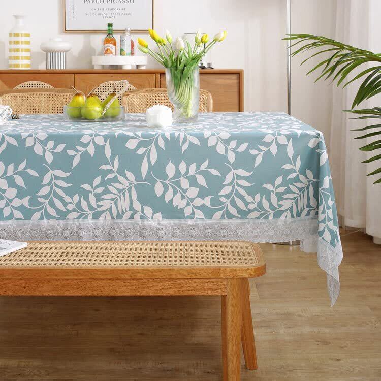 爽やかなブルーと白のリーフ柄、白い縁レースは清潔感がありお洒落で気持ちの良い食卓を演出します。