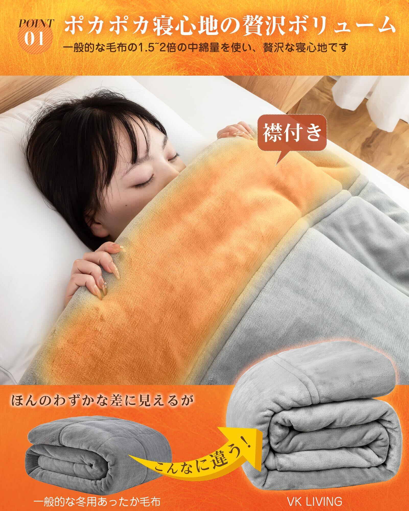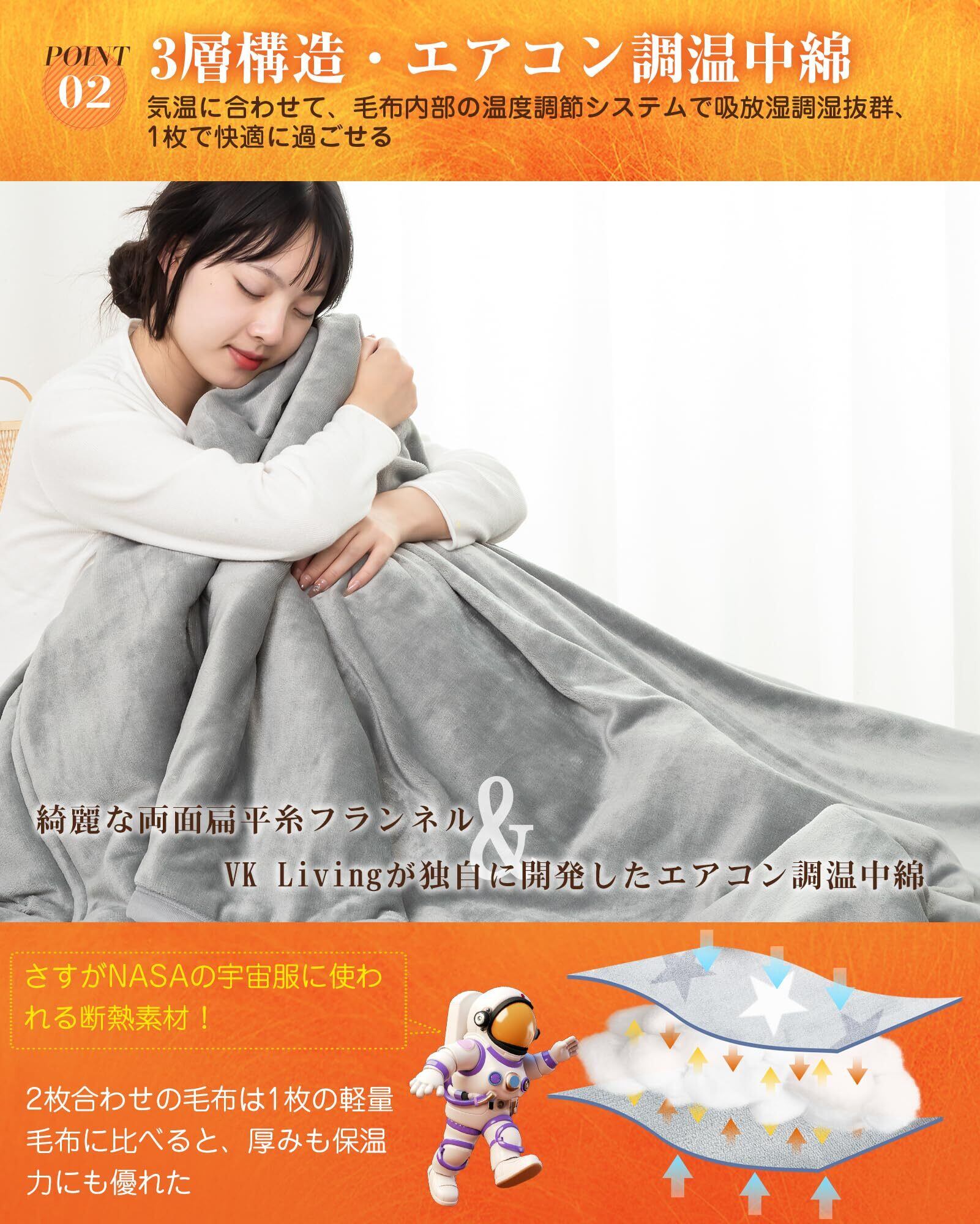 【未来のあったか毛布・快適な温度が長~く続く!】①魔法瓶効果かつ瞬間超発熱の「扁平糸」フランネル素材+②VK Livingが独自に開発したエアコン調温中綿+③保湿加工を施したフランネルで、2024年の新技術により創造したこだわりの3層構造毛布です。秋から春まで長期間使用でき、季節の変わり目にも重宝します。