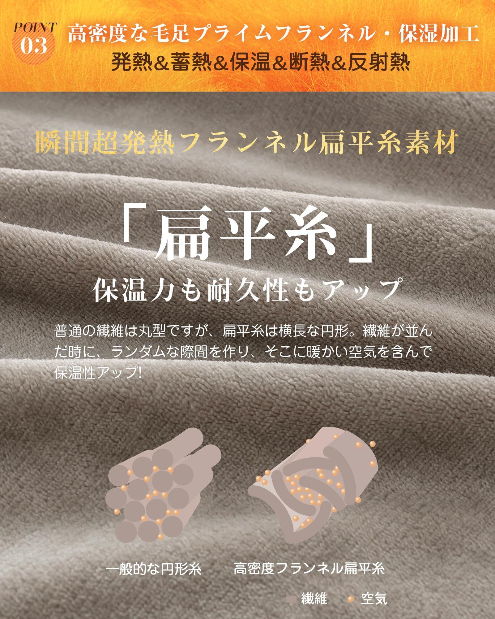 【静電気ダブル抑制・保湿加工】静電気防止加工が施されており、冬場の乾燥した空気による静電気を軽減します。裏地に保湿加工を施しており、お肌にハリと潤いを与えます。また、肌の水分を適切に調整し、潤いを保つ効果もあります。まるで裸族のふわふわ毛布です