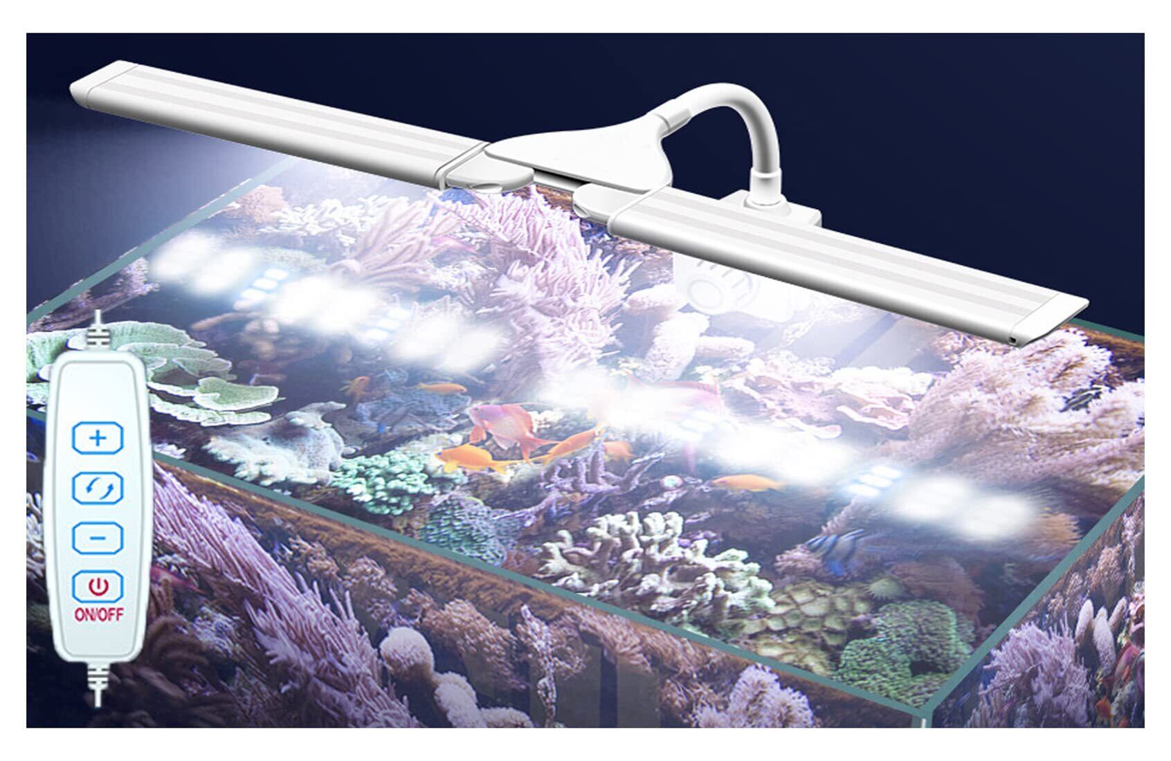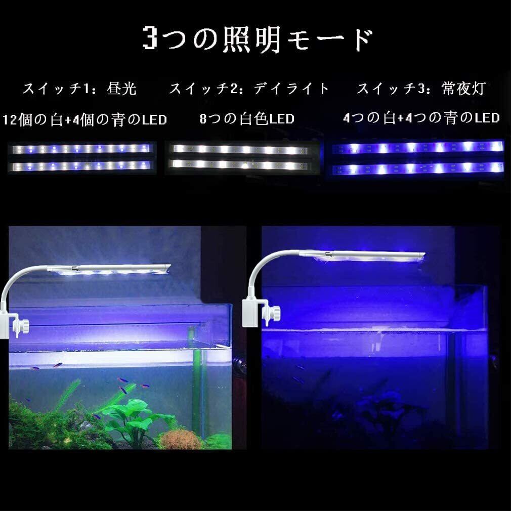 【植物成長のためのプロの3つの照明モード】:3つの照明モード:白と青のLED(昼光)、白(昼光)と青のLED(夜光)。明るさ調整可能:水槽照明ライトは光が1段階から10段階まで徐々に明るくなります。明るさと点灯モードの変更でさまざまな照明効果を調整して。観賞魚の飼育、水族館の植物栽培のために専門的に設計された。