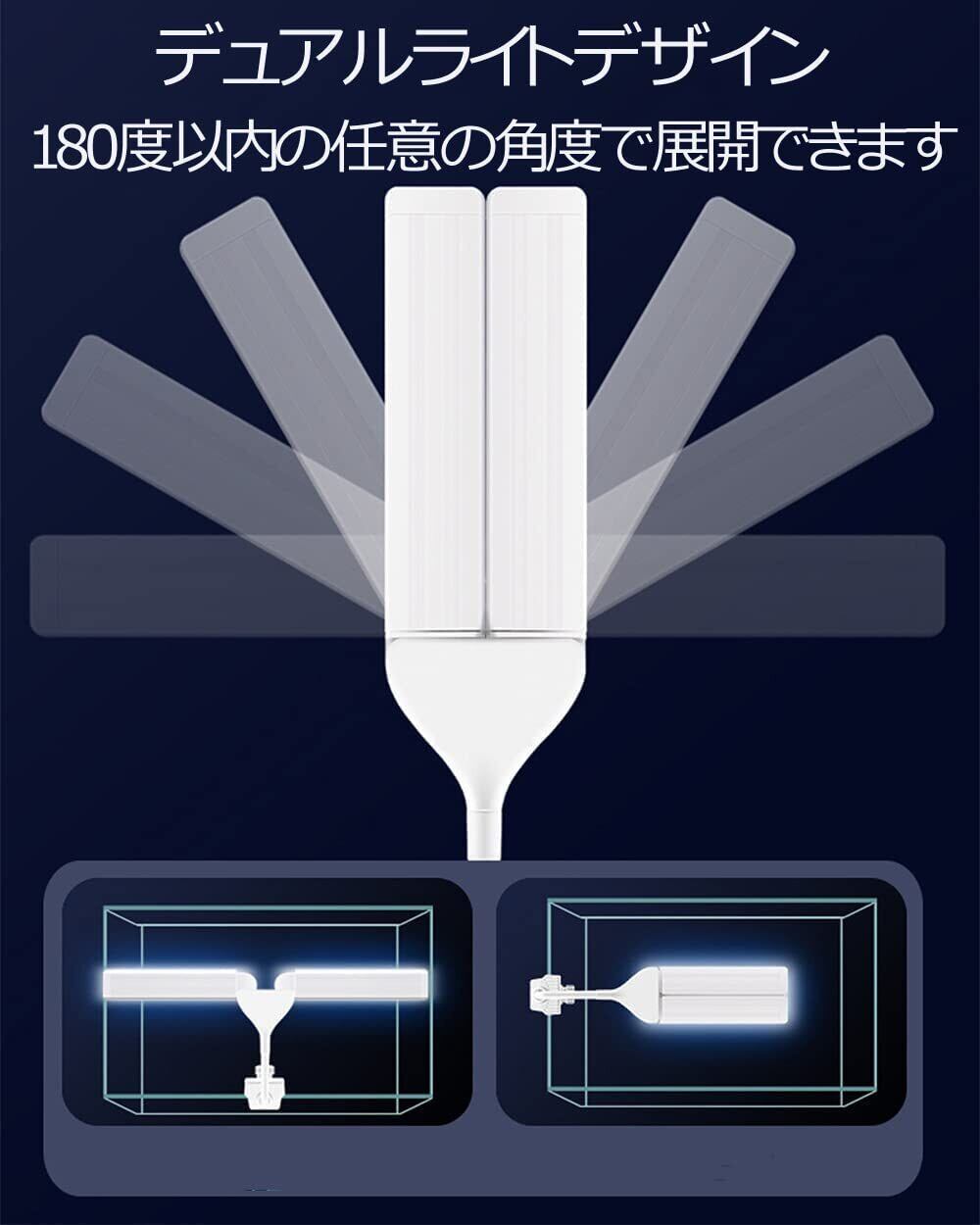 【両灯設計&180度展開】このアクアリウム ランプは、最新のデュアル ランプ スプリット デザインを採用し、両側に180度まで展開できますので、全方位に照射でき,光線もより均一です。照射角度は360度で水槽の奥行き全体まで明るく照らすことが可能です。水槽ライトは本体の長さが17cmで、展開時の長さが30cmで、14-50cmの水槽に使用可能です。