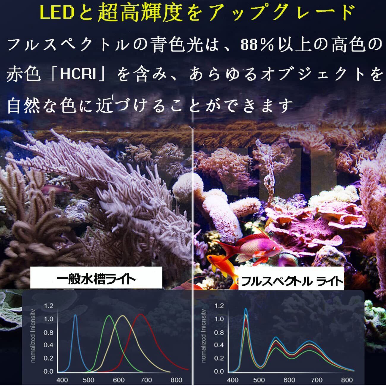 【LEDのアップグレードと超高輝度】88%以上の高色赤化「HCRI」を備えたフルスペクトルの白と青の光で、自然な色に最も近いあらゆるオブジェクトをレンダリングできます。アクアリウムの植物育成、サンゴ礁、魚、カエル、カメ、cichlidsに最適。湿気の影響を防ぐために、ガラスまたはアクリルキャノピーを備えた水槽に推奨されます。