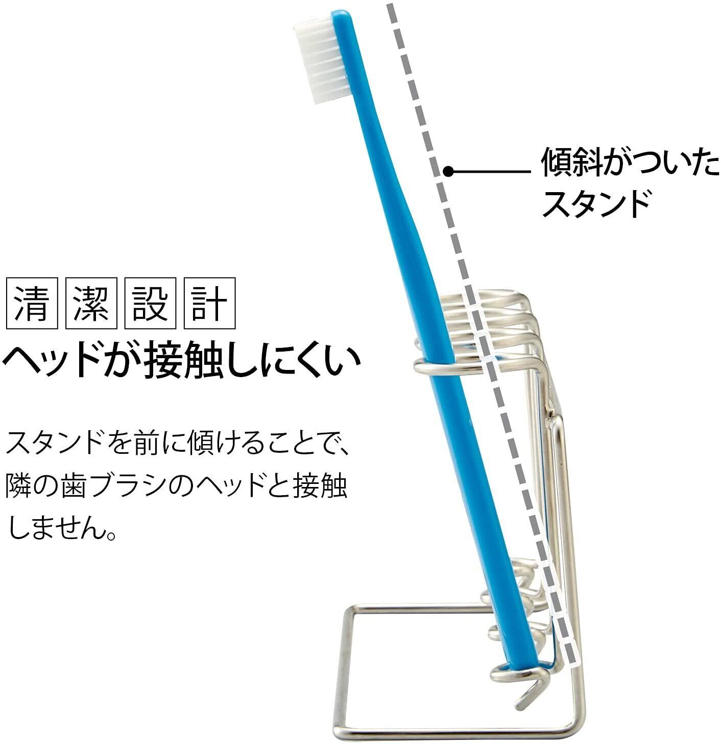 スタンドに傾斜がついていて歯ブラシが前に傾くので、隣の歯ブラシとヘッドが接触するのを防ぎます。