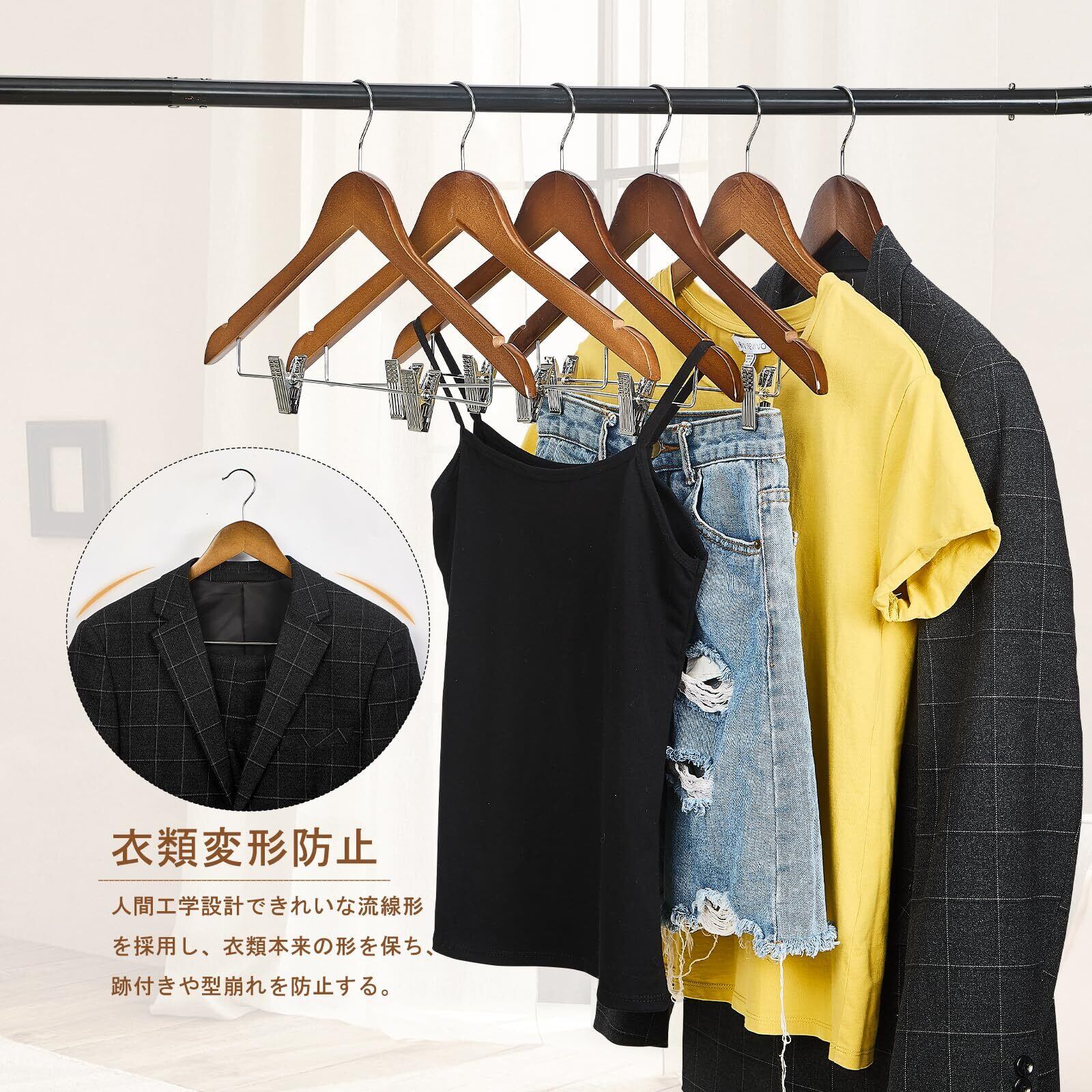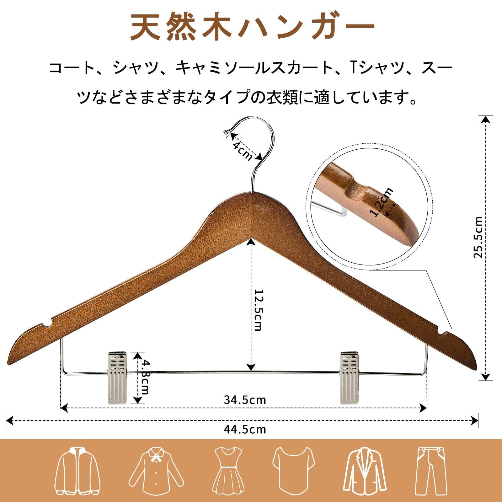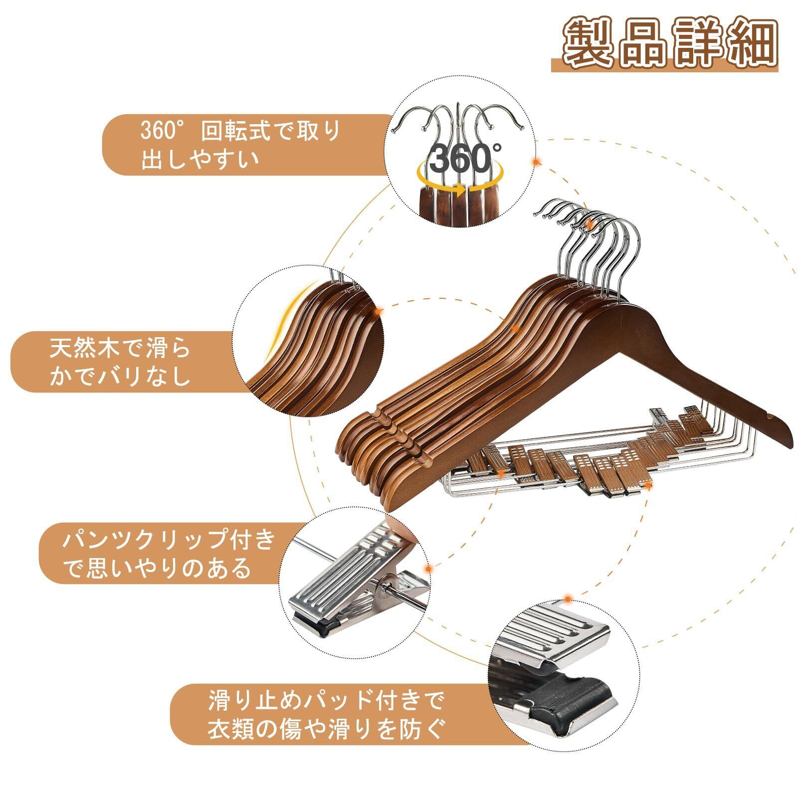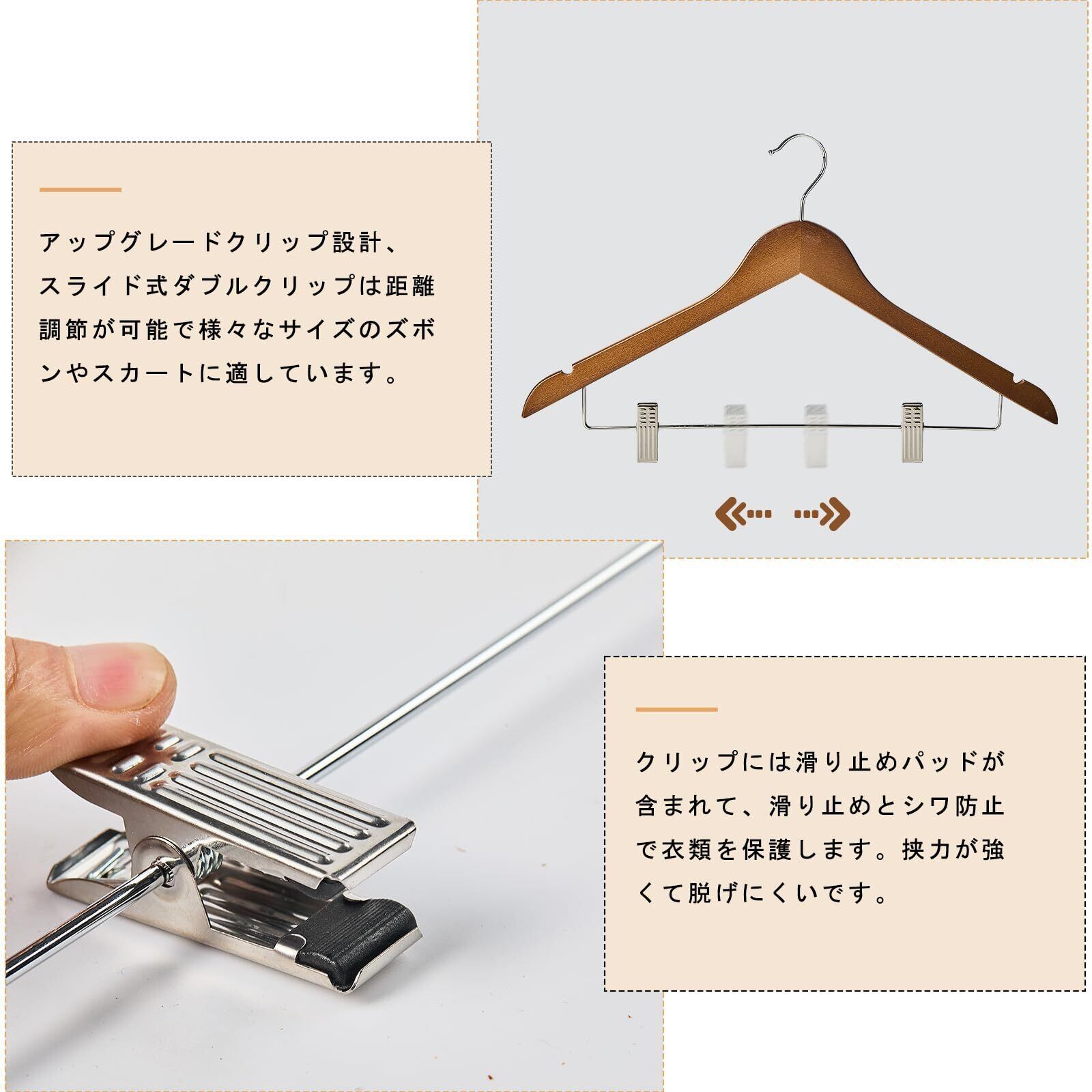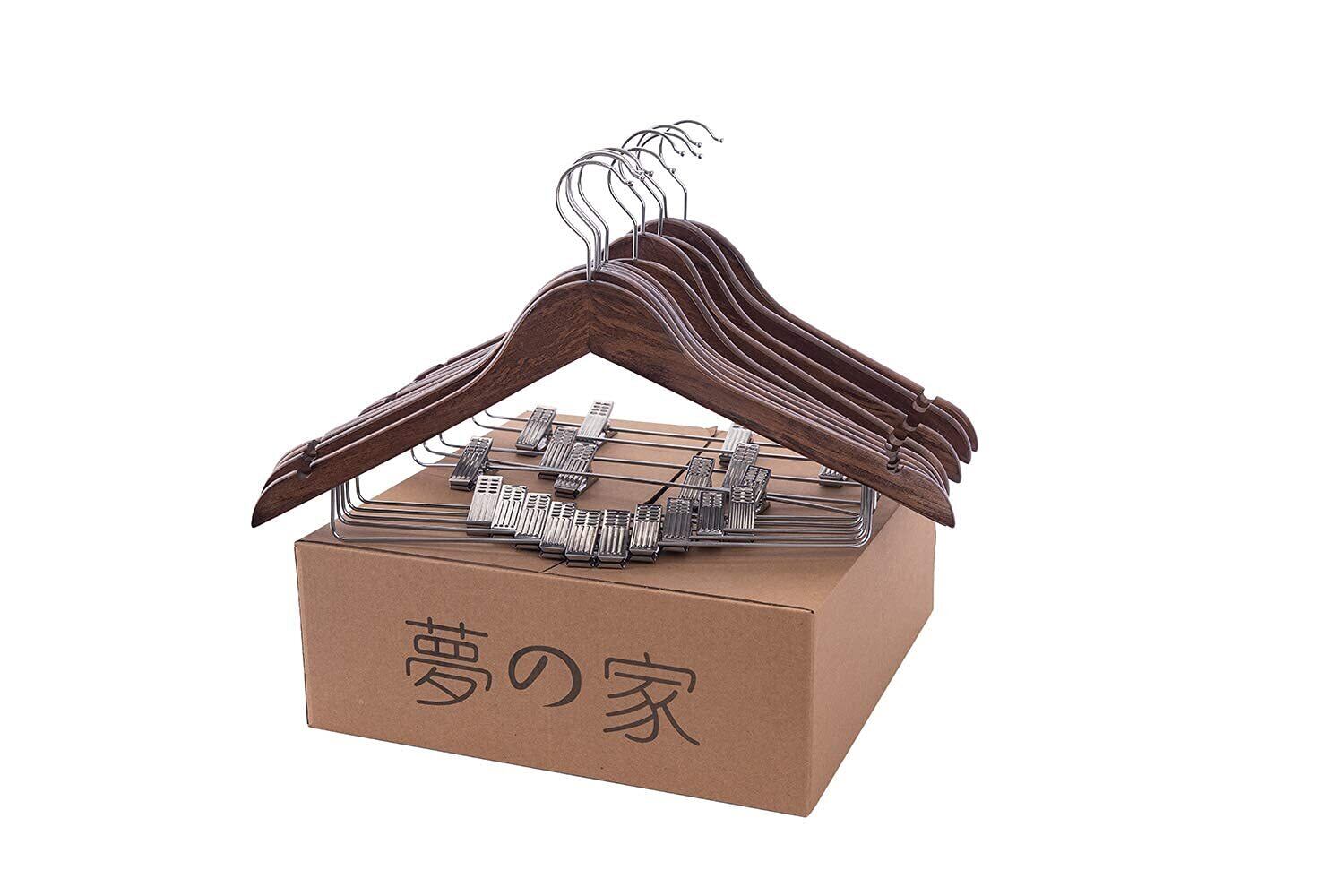 夢の家木製スーツハンガー クリップ付きハンガー 10本セット スーツ ジャケット コート用 手作 天然高級木 (茶色 10)