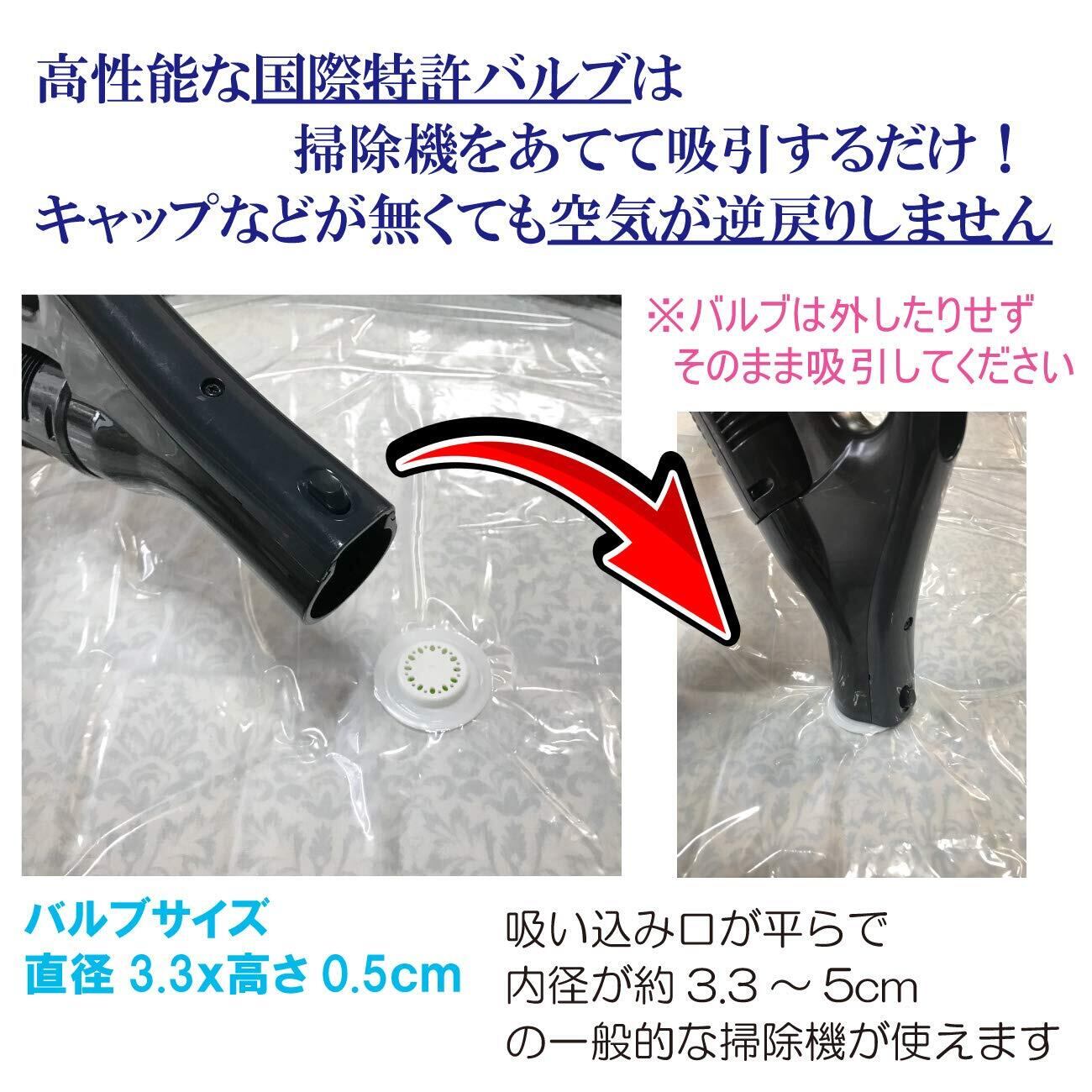 掃除機でカンタン!特許 自動ロック スピードバルブ + 二重ファスナー付き/カンタンに手早く圧縮できる便利な圧縮袋のお得セット。手押しでも圧縮できるので、小さなポンプで空気を抜く手間が不要!(手押しのみでの圧縮は時間がかかりますので、掃除機との併用をおススメ致します) 中身が見えて取り出し時も便利。