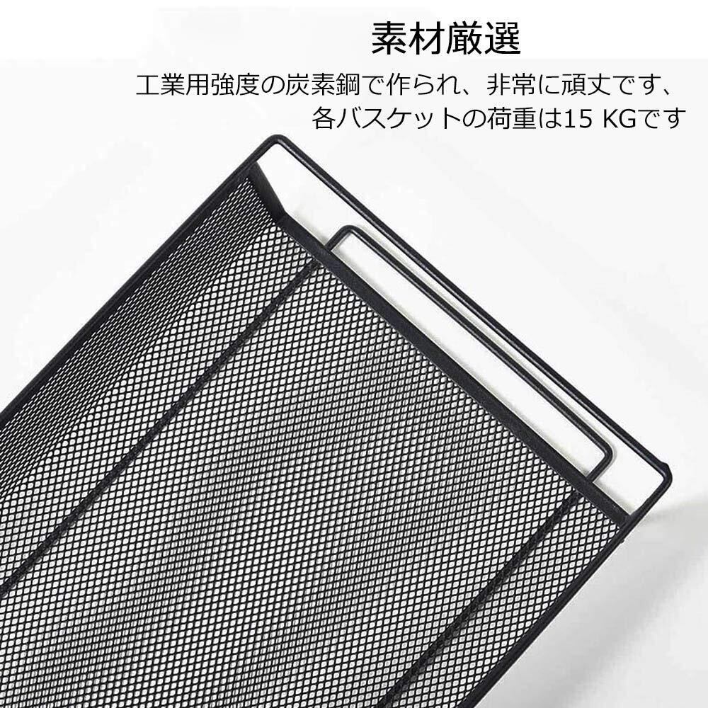 【軽くて丈夫なスチール製の3段のラック】工業用強度の炭素鋼で作られ、非常に頑丈です。カゴのメッシュが細かくて物を載せやすくしています。またトレーを外すことができ、掃除もしやすくなります。中身が見えますので、探しやすく通気性も良くて便利です。