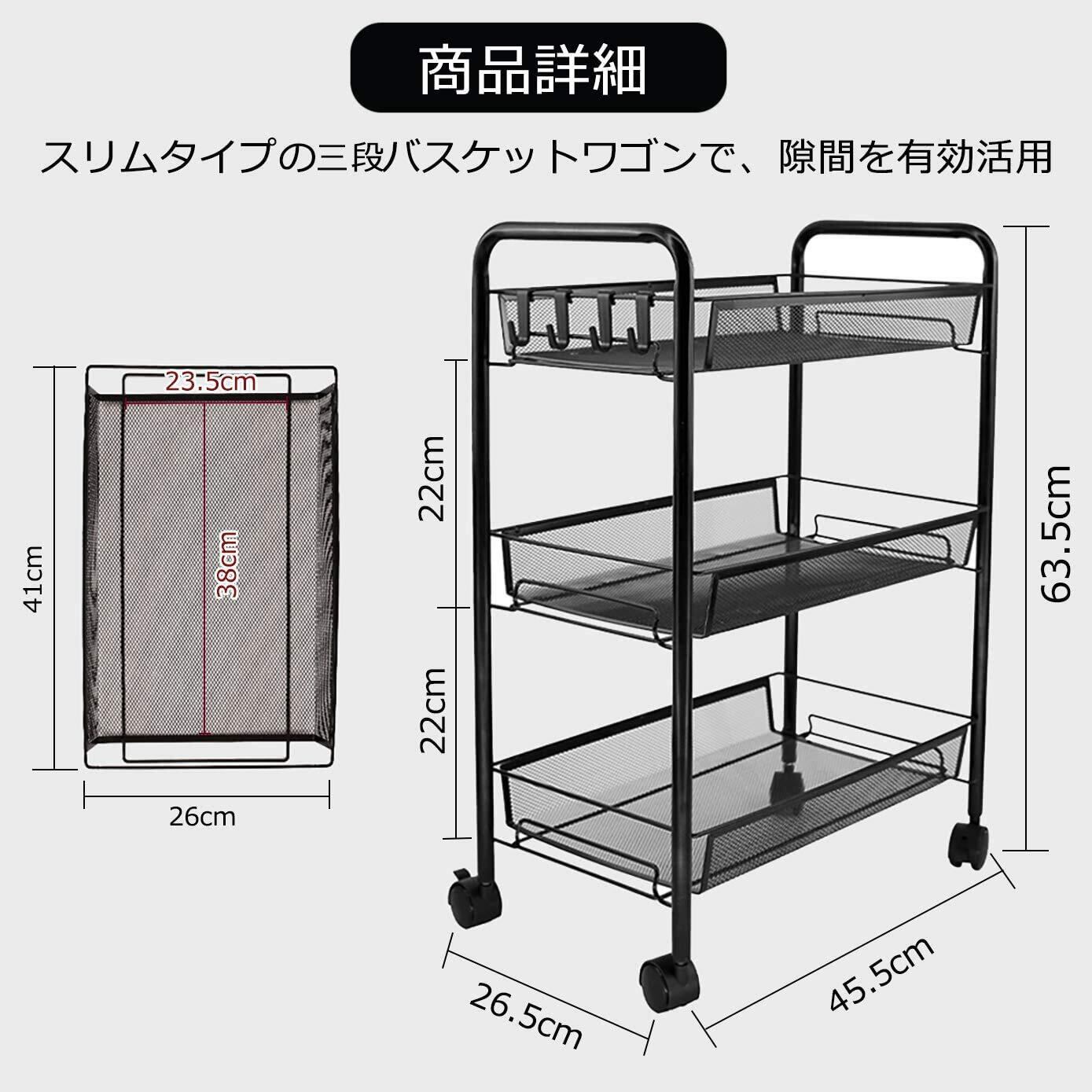 【商品詳細】本体サイズ:幅26.5×奥行45.5×高さ63.5cm 重量(約):2.35Kg 耐荷重(約):45kg(一つあたり15kg)バスケット間口:幅26 奥行41cm バスケット内寸:幅23.5 奥行38 高さ6cm
