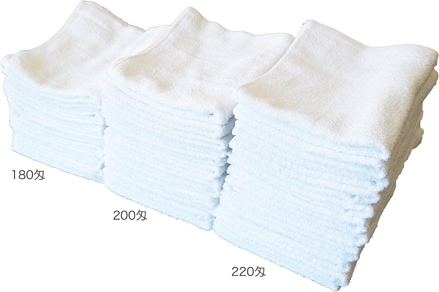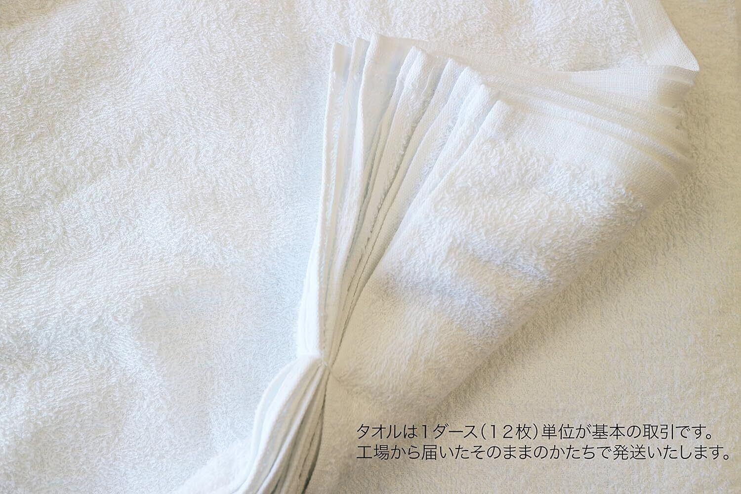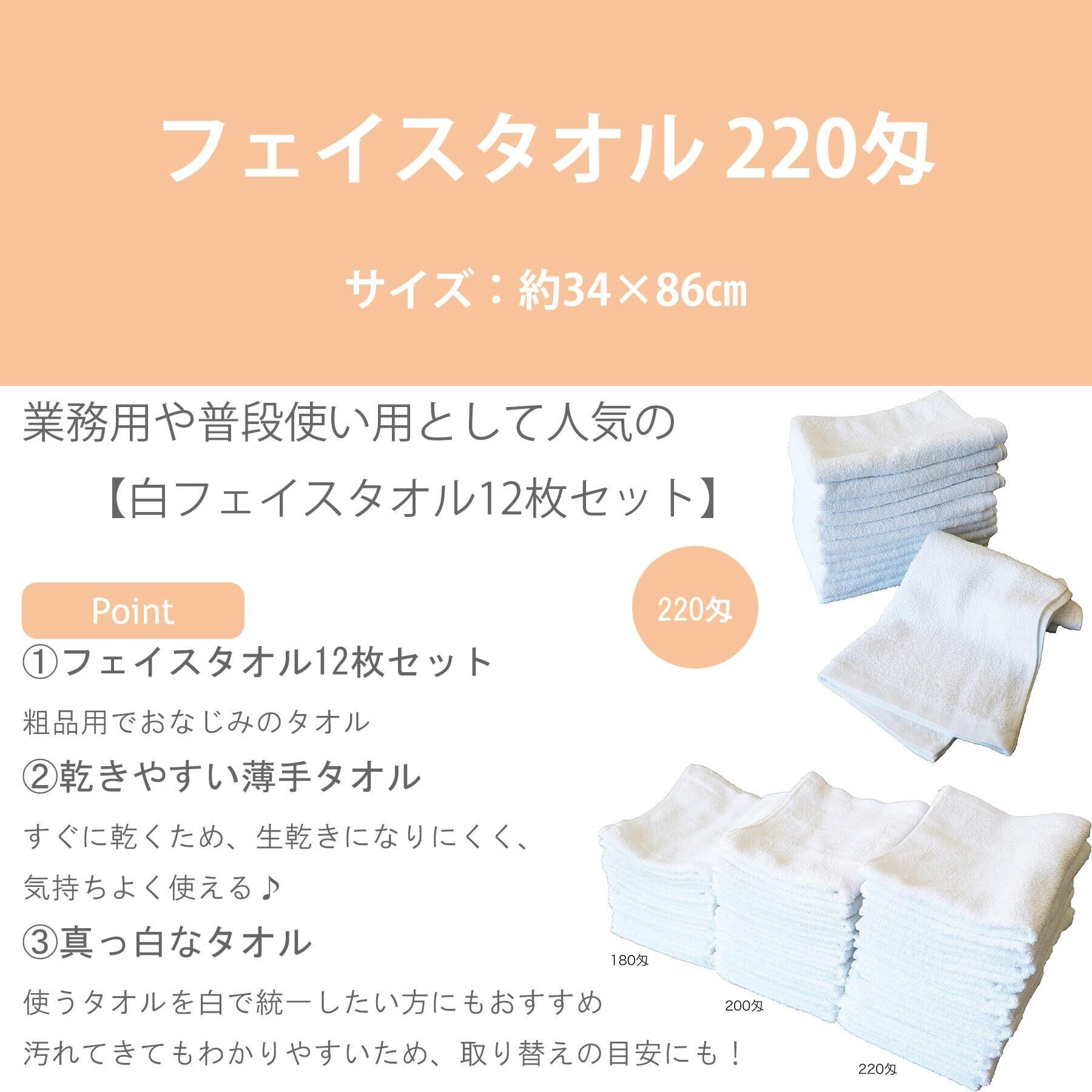 業務用や普段使い用として人気の【白フェイスタオル12枚セット】です。 ■何にでも使いやすいタオル 220匁は粗品用として使用されることの多い厚みのタオルです。 ほどよく薄いため、濡らしても絞りやすく、また乾いた状態でも使えます。 ■白タオルのメリット 一般的なフェイスタオル(約80cm)よりも長め(約86cm)のため 頭や首に巻いて汗取りにもおすすめです。 薄いのでモタモタしない、乾きやすいと白タオルならではのメリットも! 綿100%なので、安心して使用できます。 濡らしても乾きやすいため、いやな臭いが発生しにくいのもポイントです。 ■柄のない白タオル 使うタオルを白で統一したい方にもおすすめです。 リーズナブルな値段でまとめて取り替えられるため気分も一新できます。汚れてきてもわかりやすいため、取り替えの目安にもなります。■平地(平織り)部分のない総パイル 粗品用名入れタオルでは、プリント部分がパイルのない平地になっている場合が多いですが この商品は使い心地重視の総パイル仕様です。 パイルがあることで、平地部分よりも吸水性、肌触りが良いため気持ちよく使用できます。【サイズ】34×86cm 【カラー】白 【素材】綿100% 【生産国】中国 【仕様】12枚セット、220匁(約69g/枚)、総パイル(平地部分なし)