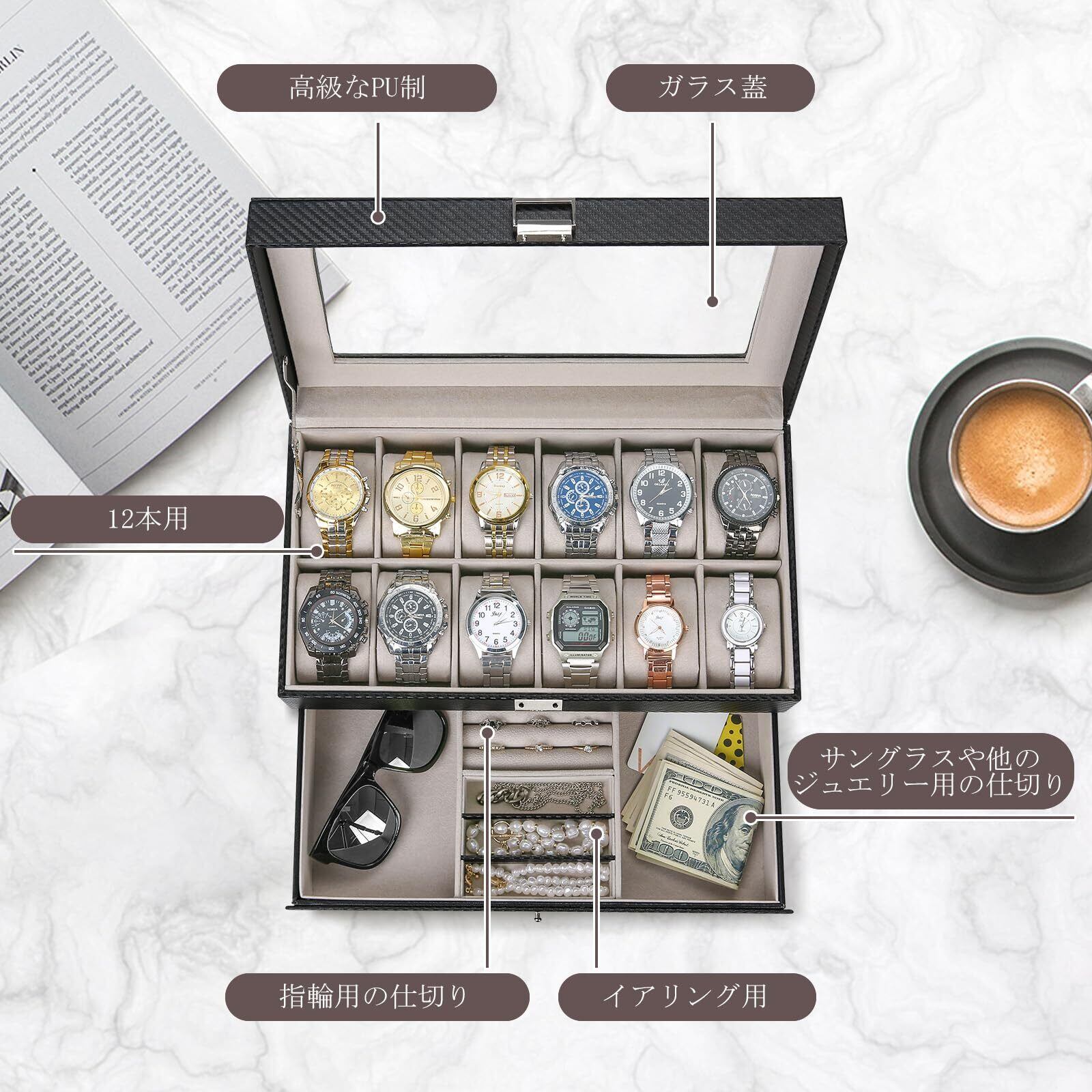⌚【サイズ】幅×奥行×高さ:約34×19×15cm 重量:約2.2kg;腕時計を12本まとめて収納できる高級感あふれる蓋つきケース。※すべての時計に対応してはいませんので、発注前、必ずサイズをご確認いただきます。