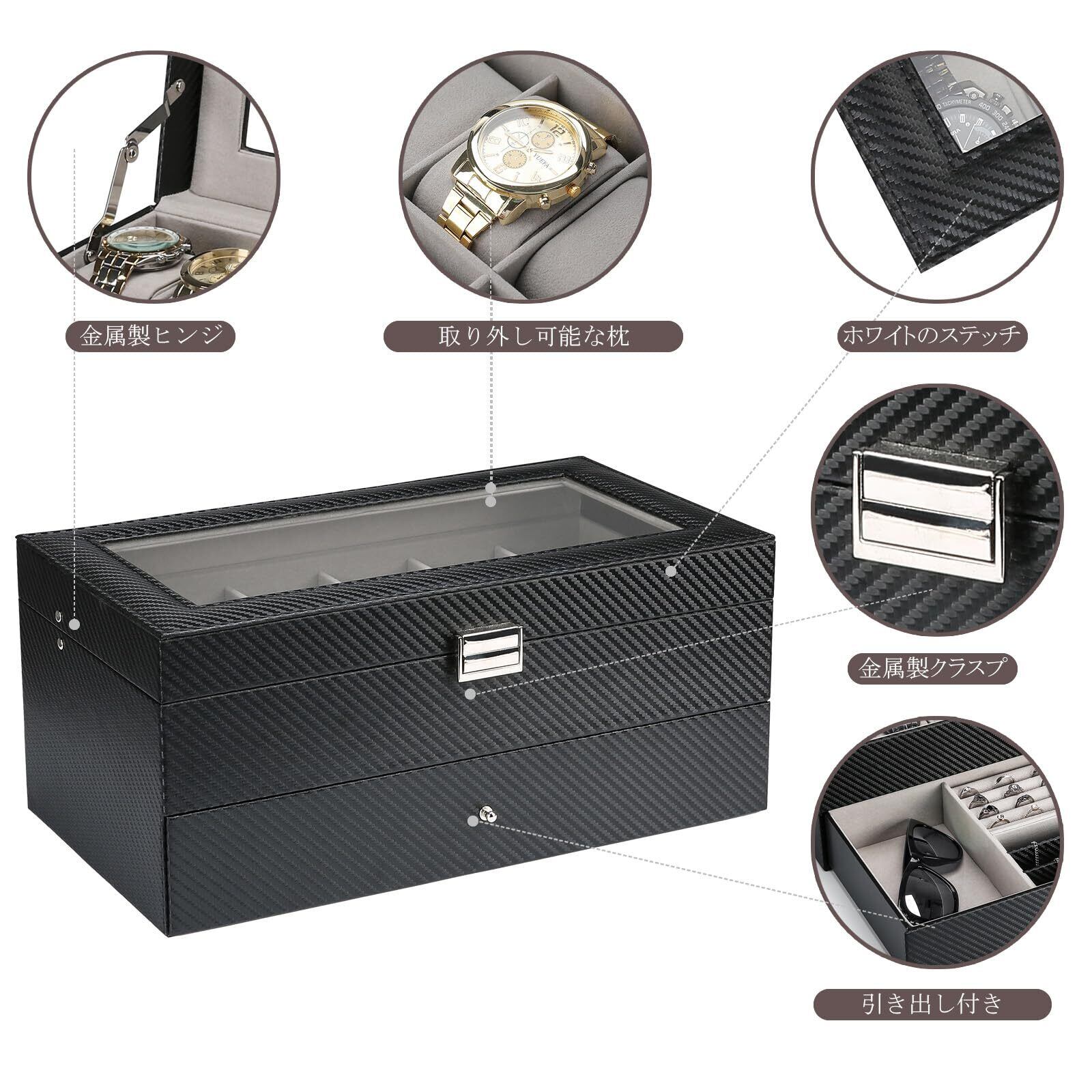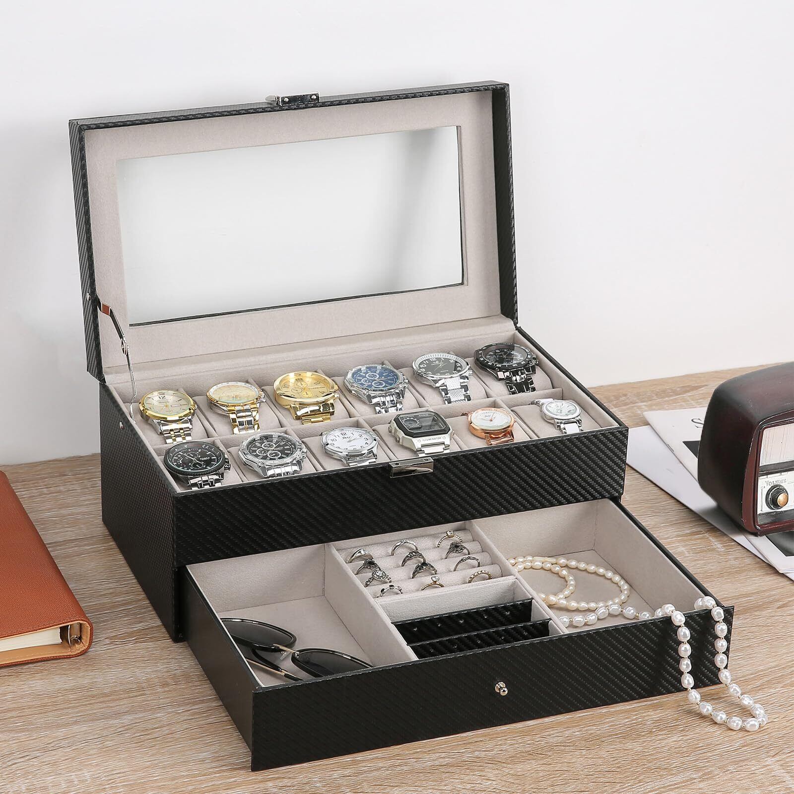⌚【2段式】普段使いの指輪やメガネやアクセサリーと一緒に収納できる二段ケースは、小物整理に重宝します!仕切りも設けられているので、中でごちゃごちゃにならず、出し入れもスムーズです。