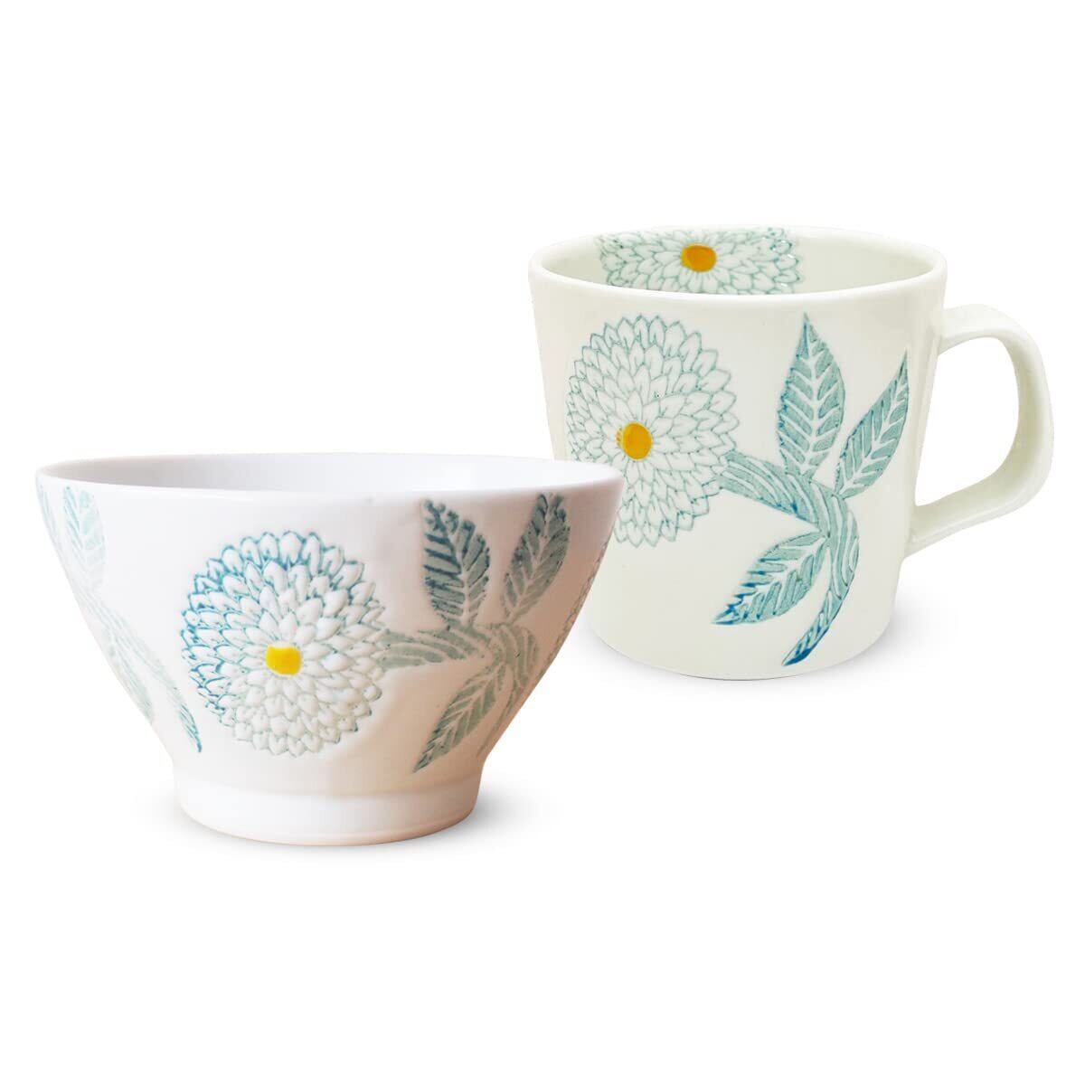 小ぶりでふっくらとした可愛らしい形が魅力のごはん茶碗です。形が可愛いのでサラダボール等、小鉢としても使用できます。北欧風のダリアデザインも食卓を素敵に演出してくれます。マグカップは、程よいサイズで軽くて洗いやすいのが◎