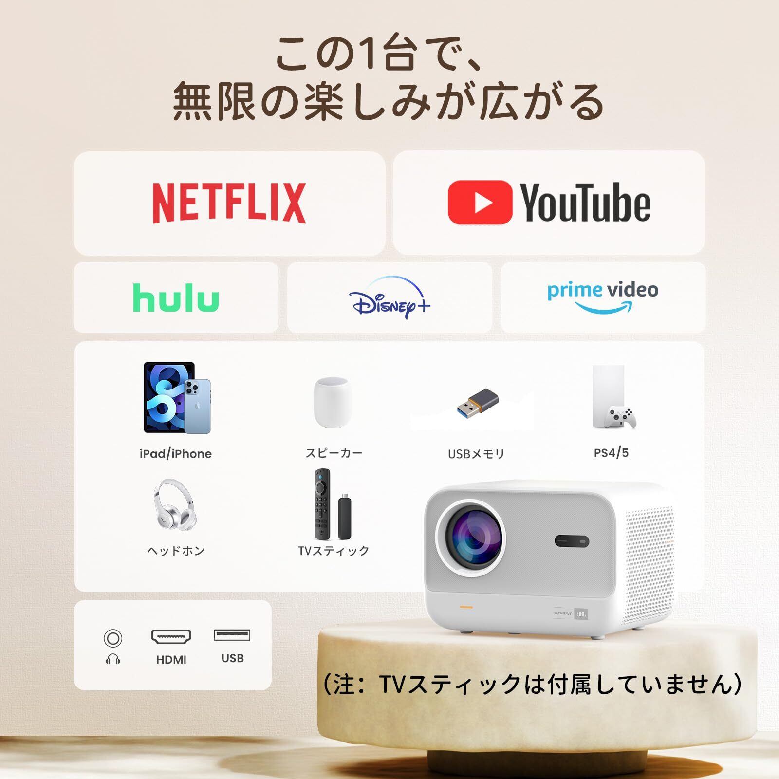 ️プロジェクター L2s にはストリーミングアプリが搭載されていません。Netflix や Disney+ などのサービスをご利用になるには、お好みに応じて TV Stick(別売り)をご使用いただくことをおすすめします。