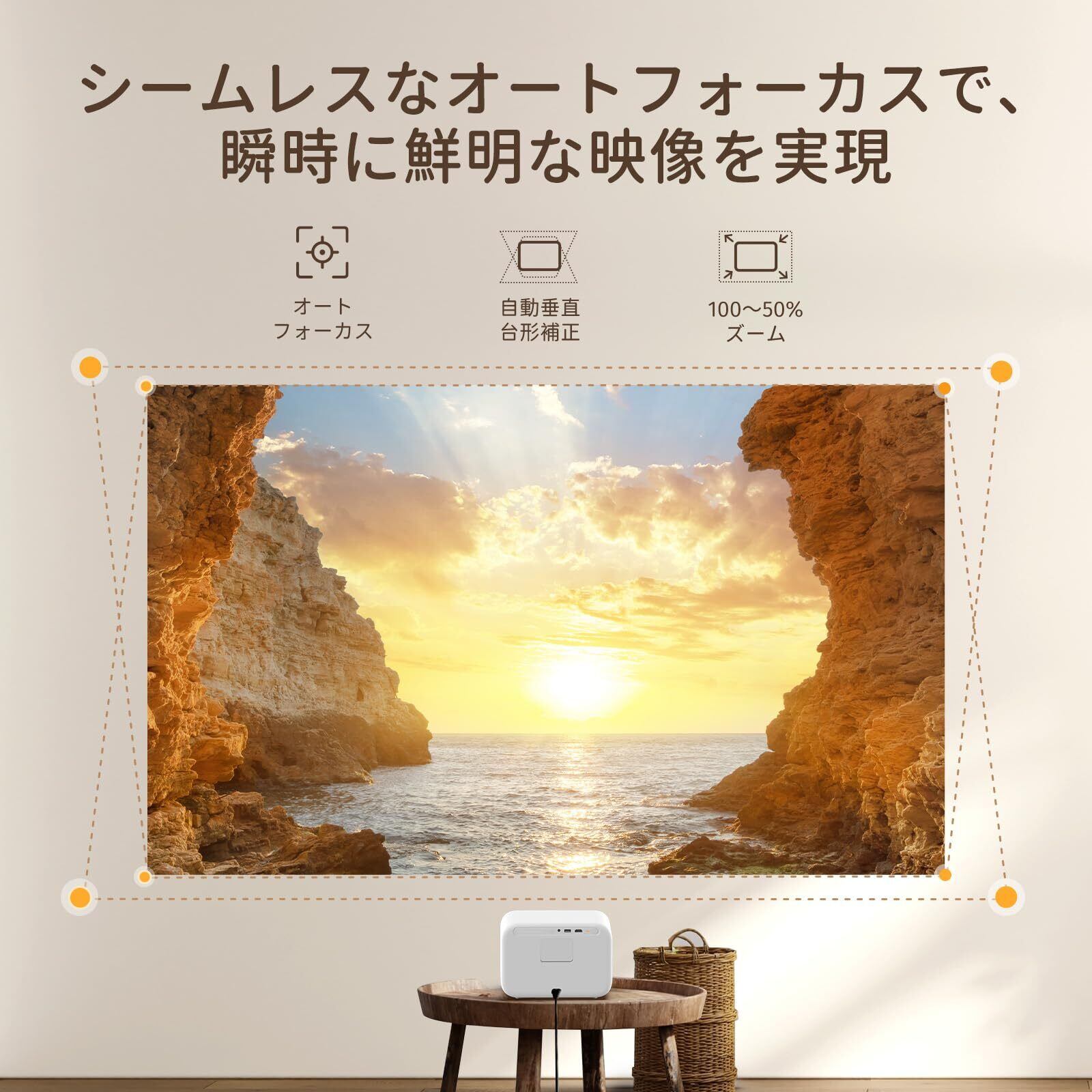 【自動垂直台形補正 & 50%ズーム機能】自動垂直台形補正により、映像の位置合わせが簡単かつスムーズに行えます。️ 水平(左右方向)の台形補正には対応していないため、斜め投影の場合、台形補正はできません。プロジェクターは正面に設置することをお勧めします。50%ズーム機能を活用すれば、設置環境に応じて画面サイズを簡単に調整でき、リビングや寝室など、さまざまな場所で気軽にご使用いただけます。
