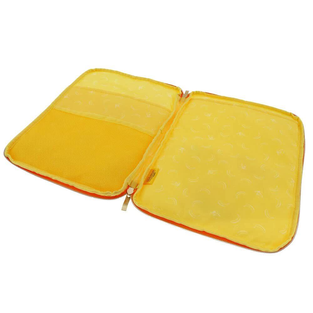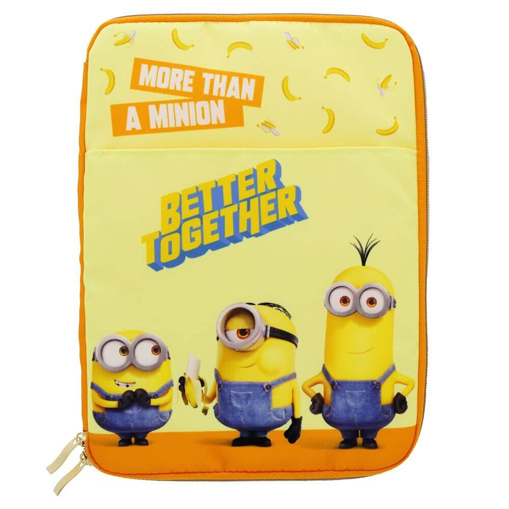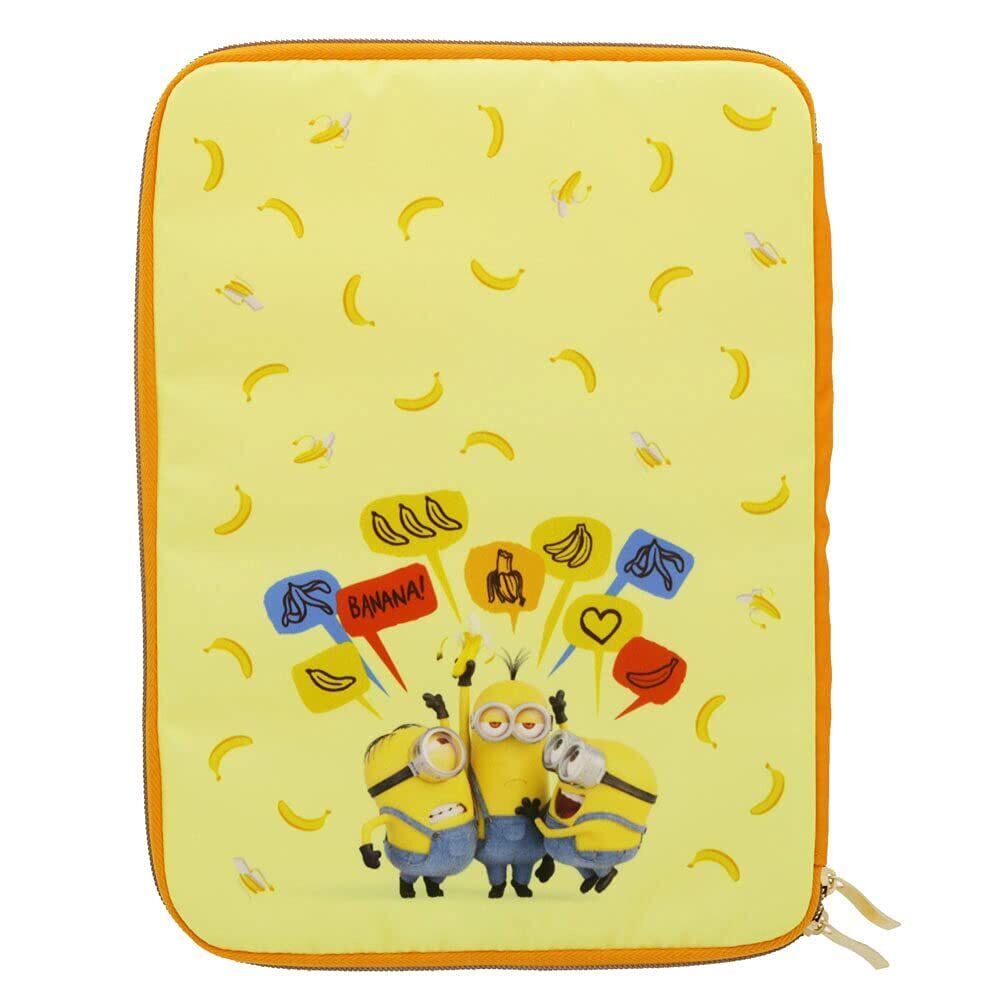 タブレットやB5ノートを入れられるMサイズのマルチケース。柄は、「ミニオン」 こちらは、たくさん並んだミニオンズとレインボー、そしてピンクのカラーが特徴的なデザイン。