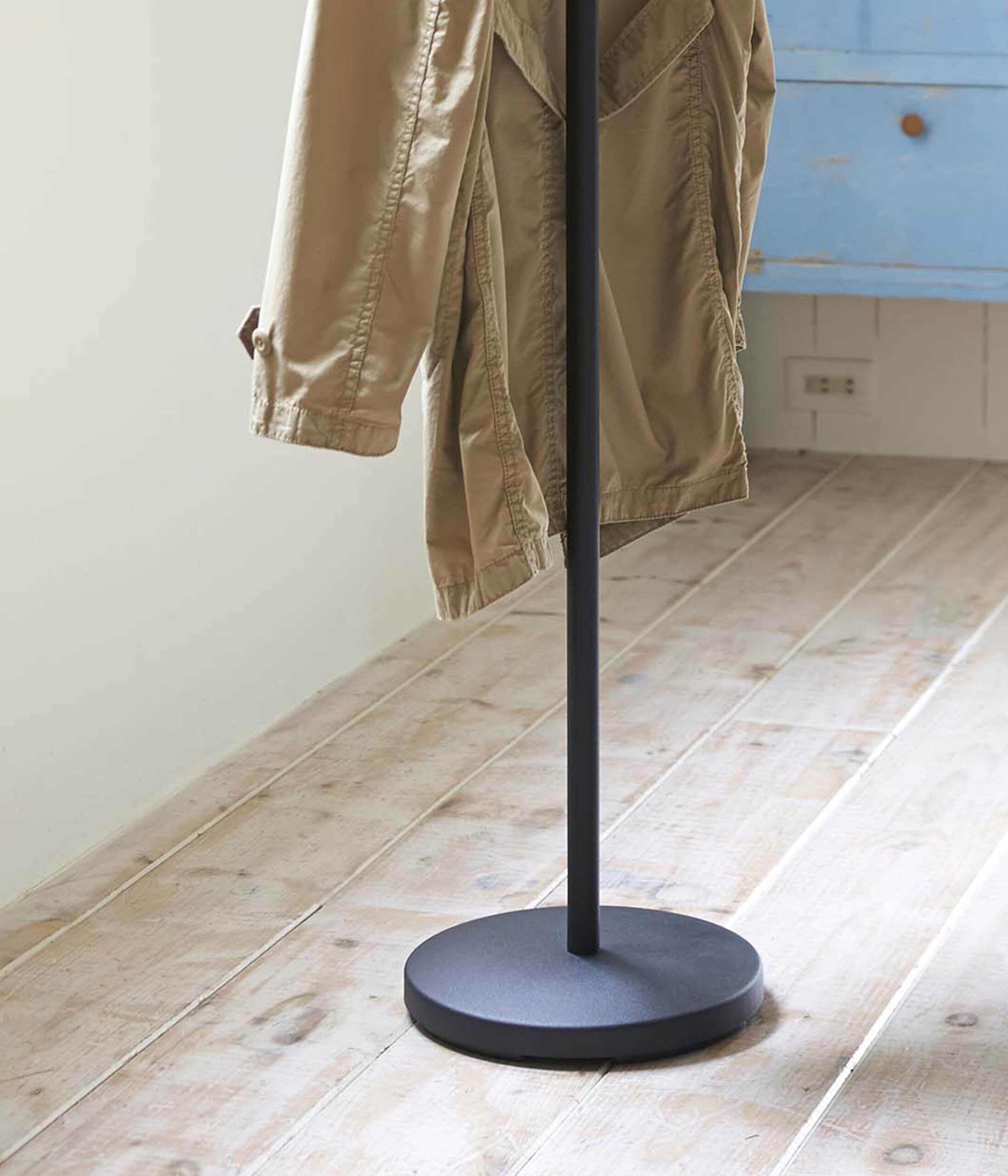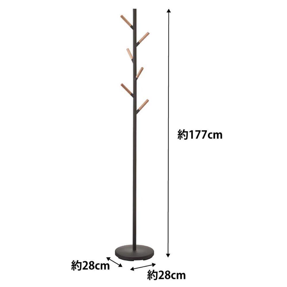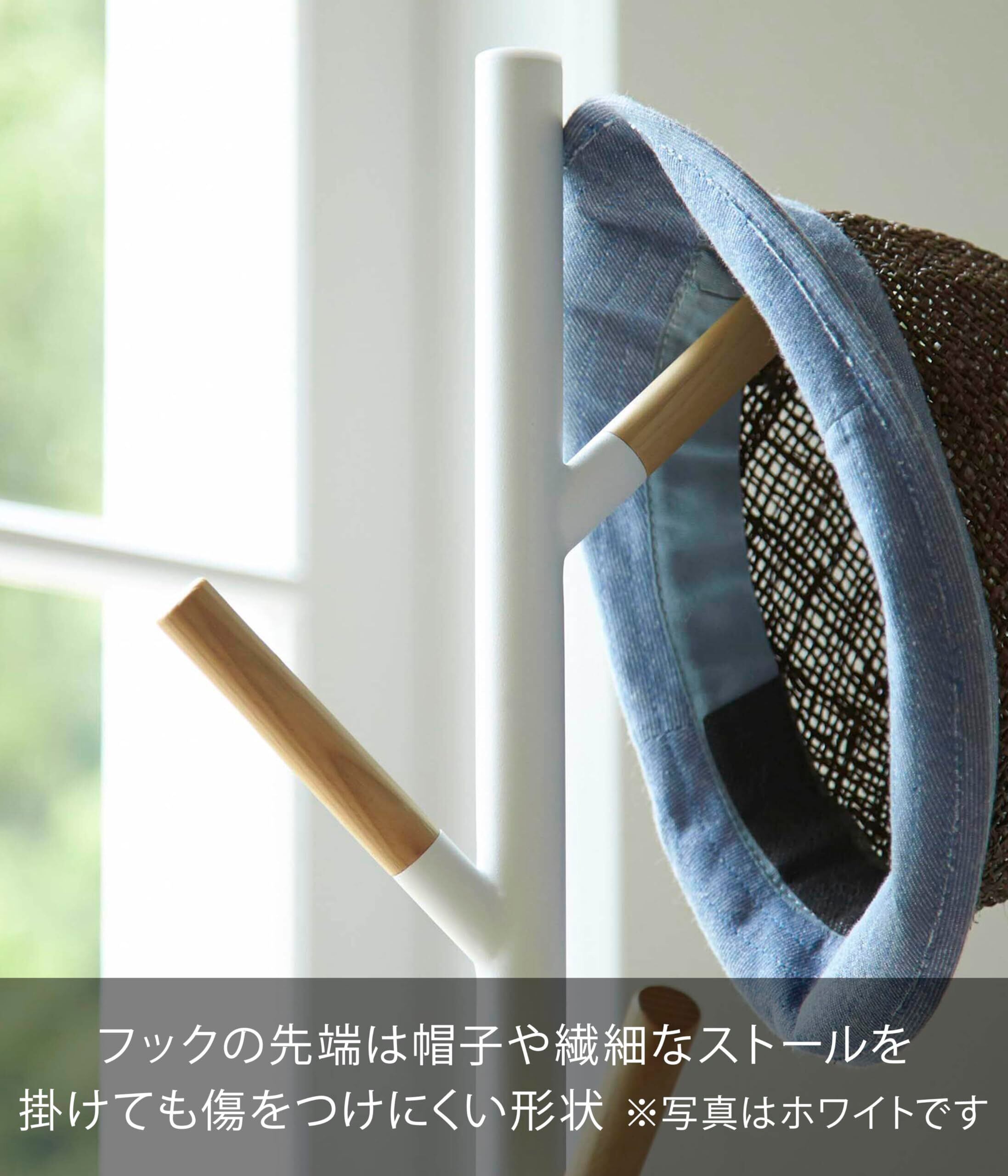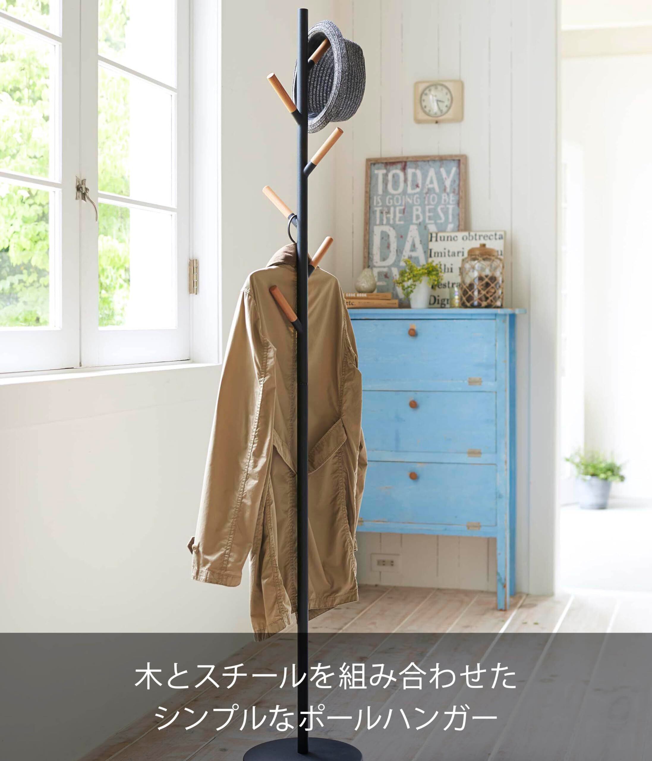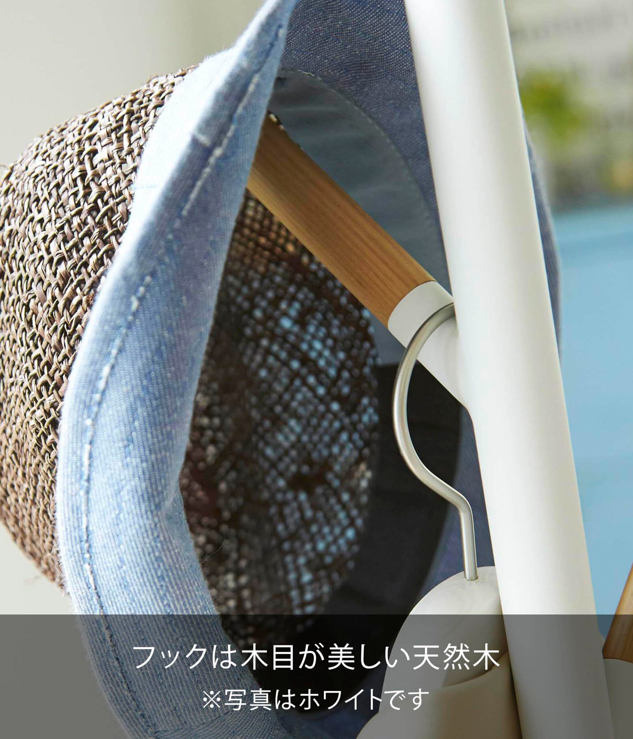 木製のバーとスチールを組み合わせたナチュラルでスタイリッシュなポールハンガー。バーの先端は帽子や繊細なストールを直接掛けても傷つきにくい。