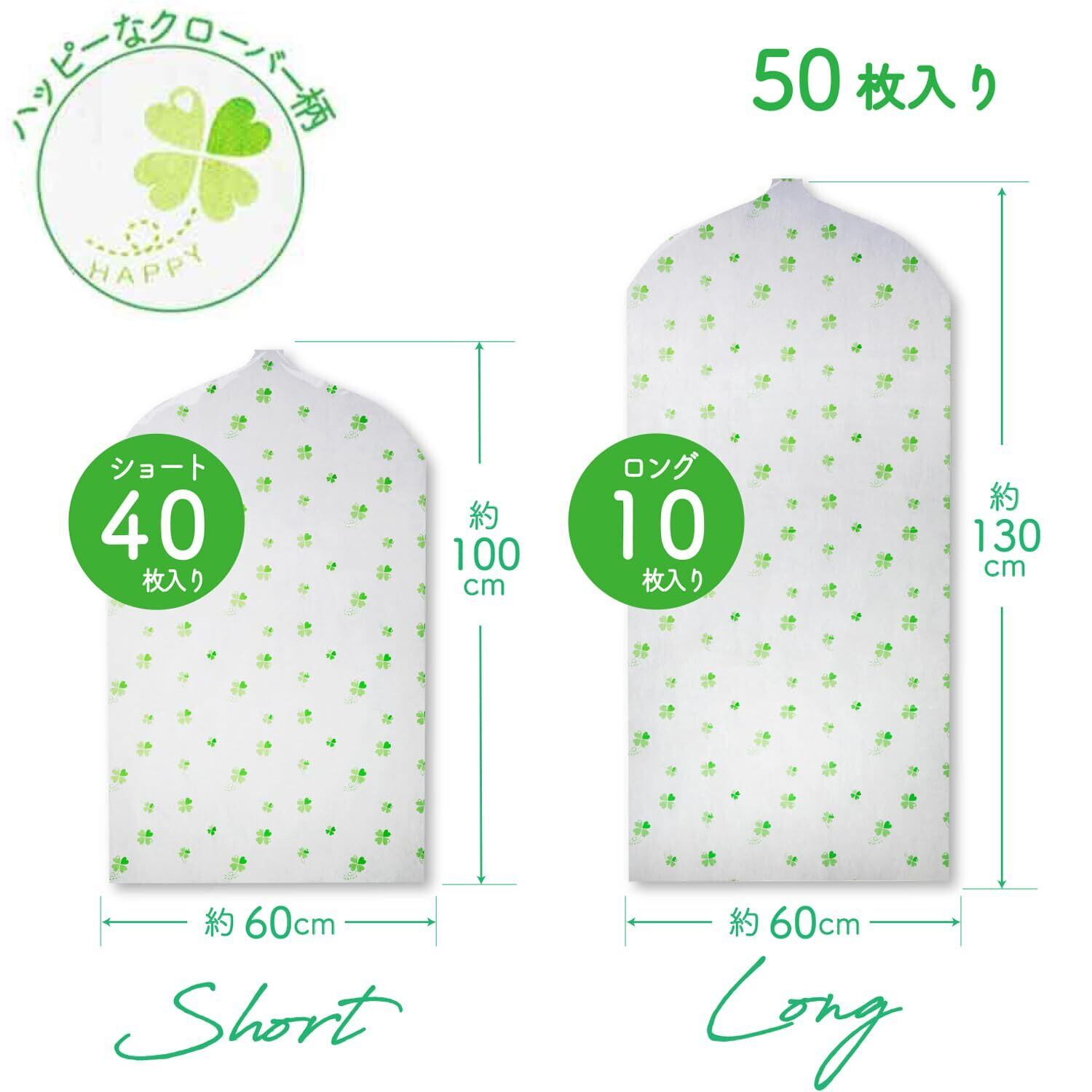 衣類カバー 洋服カバー 衣替え 不織布 クローバー柄 50枚セット (ショート40枚・ロング10枚) 日本製 片面不織布 片面ビニール 通気性 1枚ずつ取り出し可能 ティッシュ式 大容量 衣替え [(株)フォーラル]