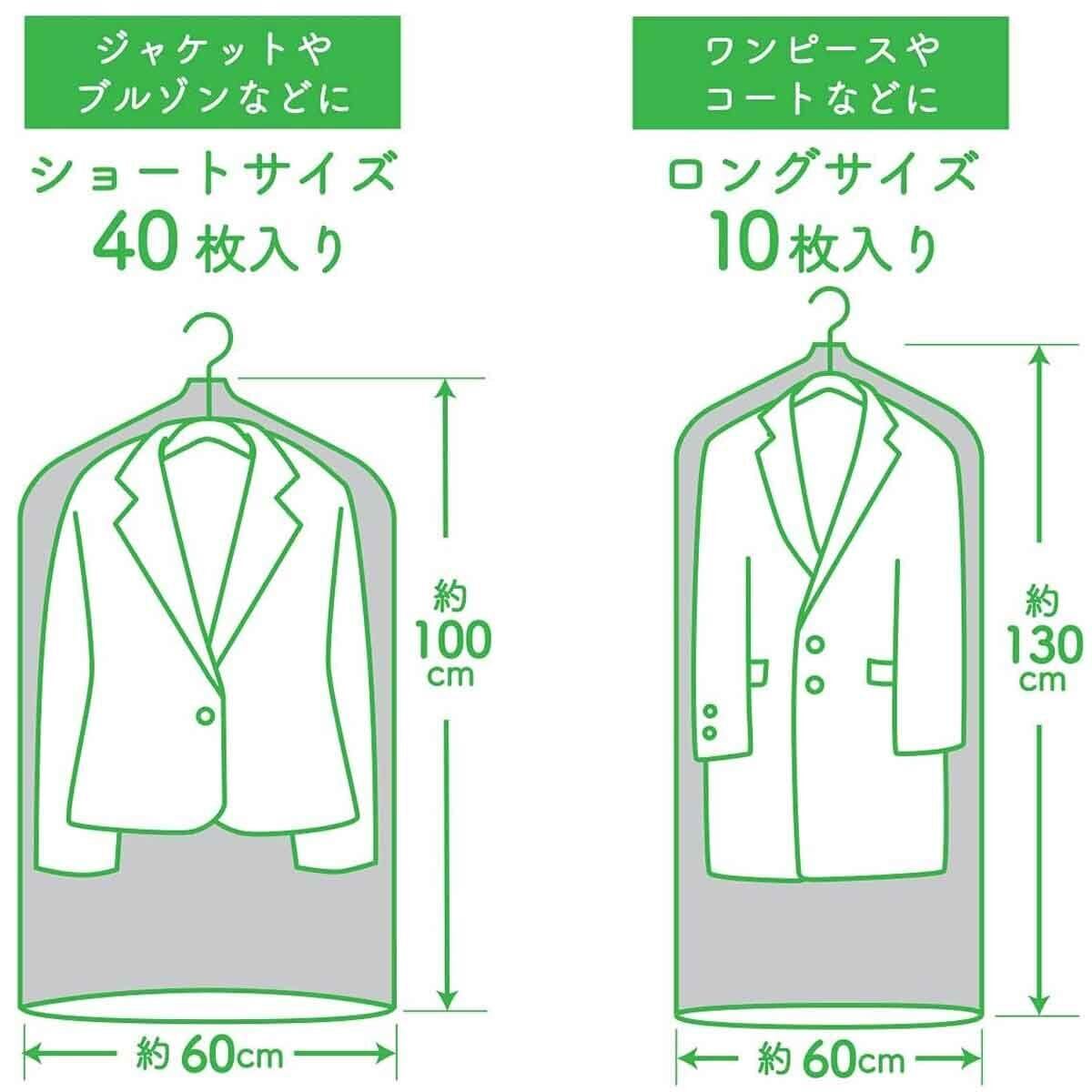 ●背面には通気性の良い不織布、表面には中身が一目で確認できる可愛い柄入りの透明フィルムを使用 ●ジャケットやブルゾンの収納にはショートサイズ、ワンピースやコートの収納にはロングサイズをお使いください ●50枚入りの収納ケースからティッシュのように必要な分だけ1枚ずつ取り出せる ●収納ケースの表面からはショートサイズ、裏面からはロングサイズと取り出し口もサイズ別に違うので使いたいサイズをすぐに取り出せる ●ショートサイズは40枚、ロングサイズは10枚入っている ●グリーンのクローバー柄 ●企画・製造・検品まですべて国内自社工場で行う信頼の日本製