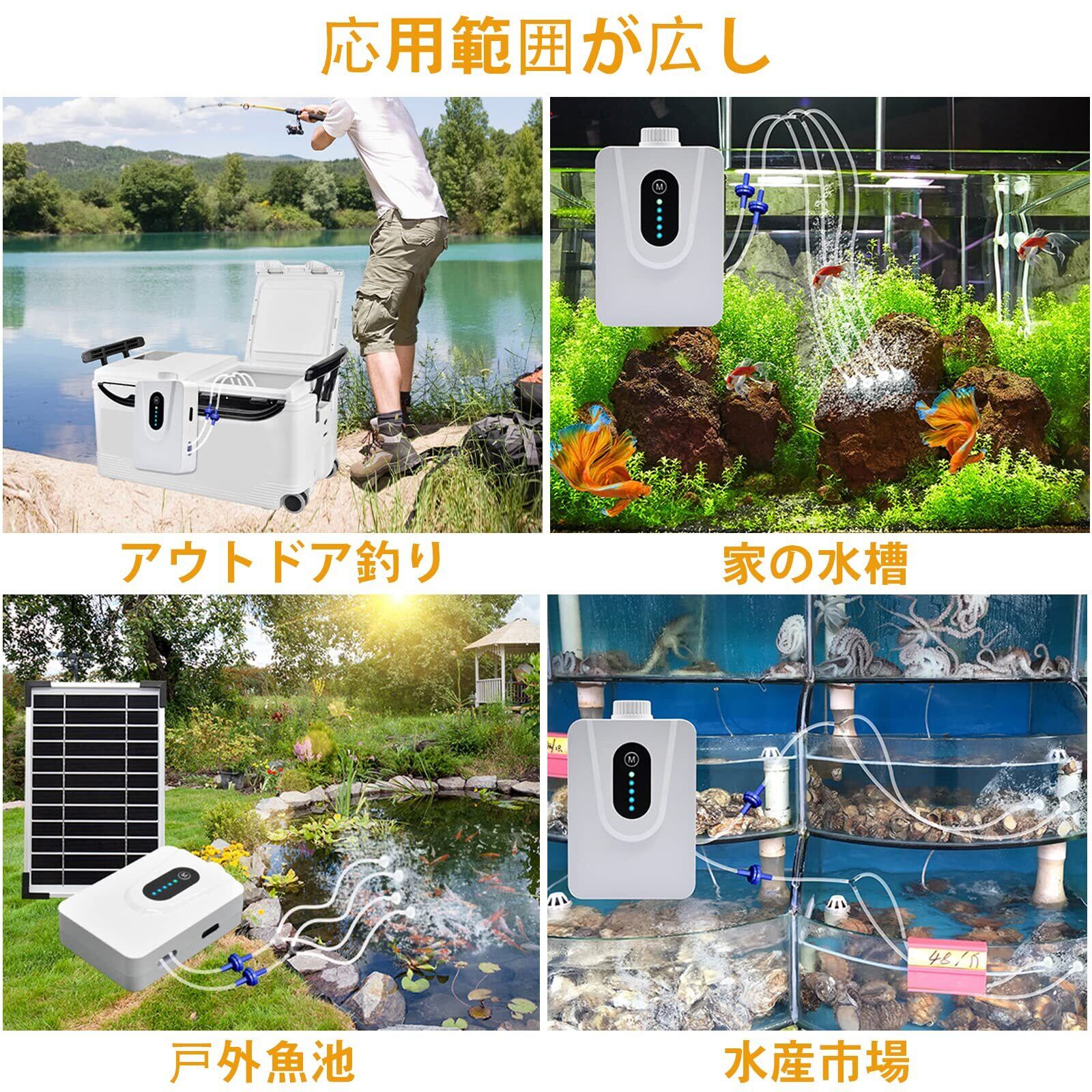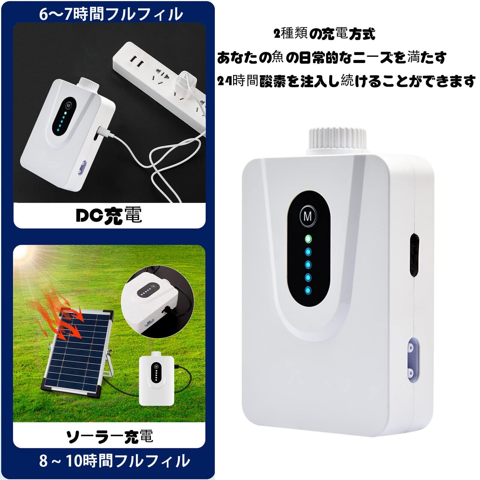 よくある質問: 1、4つのパーツが付いていますが、、最強のエアーにしても四つ使うとエアーが出ない? (答え:4つの出口空気が必要な場合は、ホースごとに止め弁を取り付けなければならない。そうしないと、空気が出られなくなる。) 2、エアーを強く(調整ツマミ)すると、異音(モーター部がコトコト)がする? (答え:ノブを最大にすると、酸素ポンプが音を出すのは正常な現象で、酸素ポンプの中にはモーター構造が起動して必ず音がするので、使用に影響はありません。) 3、ベランダで使ってますが毎日充電してます。ソーラーでは補えないです? (答え: 太陽光パネルにほこりや遮蔽物があると、太陽光が充電できなくなり、太陽光パネルをきれいに掃除し、直射日光を当てることで簡単に問題を解決する必要があります。)