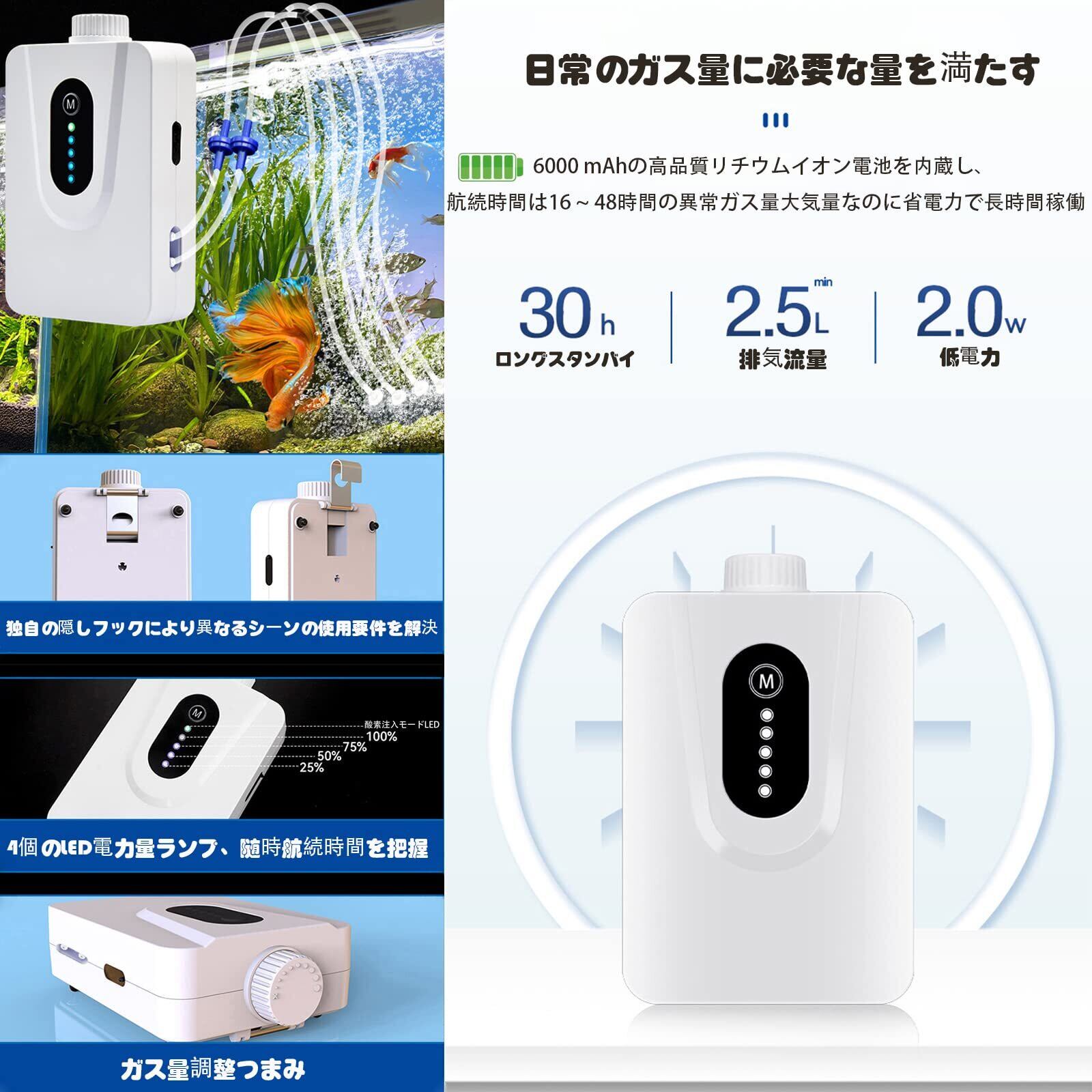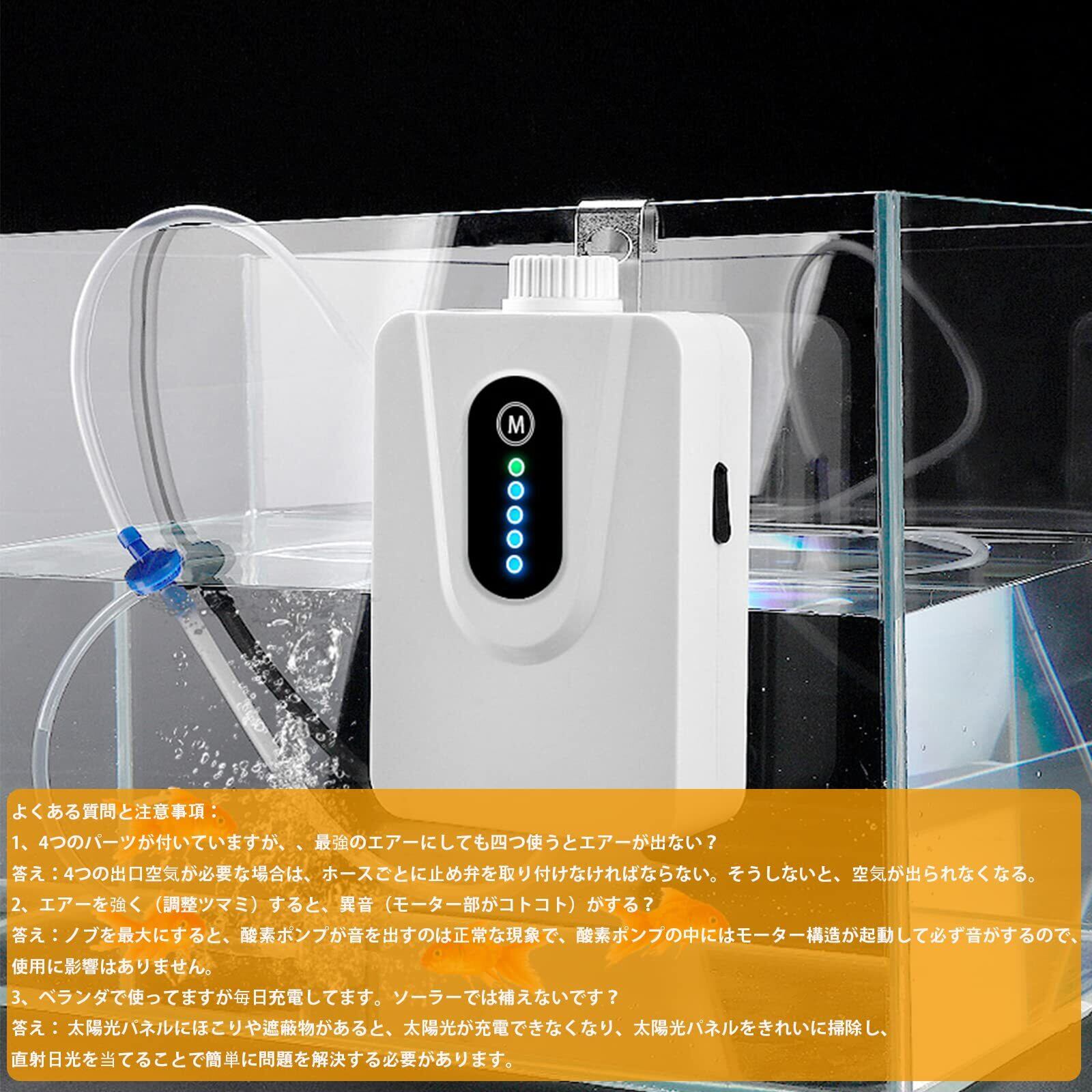 よくある質問: ①、4つのパーツが付いていますが、、最強のエアーにしても四つ使うとエアーが出ない? (答え:4つの出口空気が必要な場合は、ホースごとに止め弁を取り付けなければならない。そうしないと、空気が出られなくなる。)②、エアーを強く(調整ツマミ)すると、異音(モーター部がコトコト)がする? (答え:ノブを最大にすると、酸素ポンプが音を出すのは正常な現象で、酸素ポンプの中にはモーター構造が起動して必ず音がするので、使用に影響はありません。)③、ベランダで使ってますが毎日充電してます。ソーラーでは補えないです? (答え: 太陽光パネルにほこりや遮蔽物があると、太陽光が充電できなくなり、太陽光パネルをきれいに掃除し、直射日光を当てることで簡単に問題を解決する必要があります。)