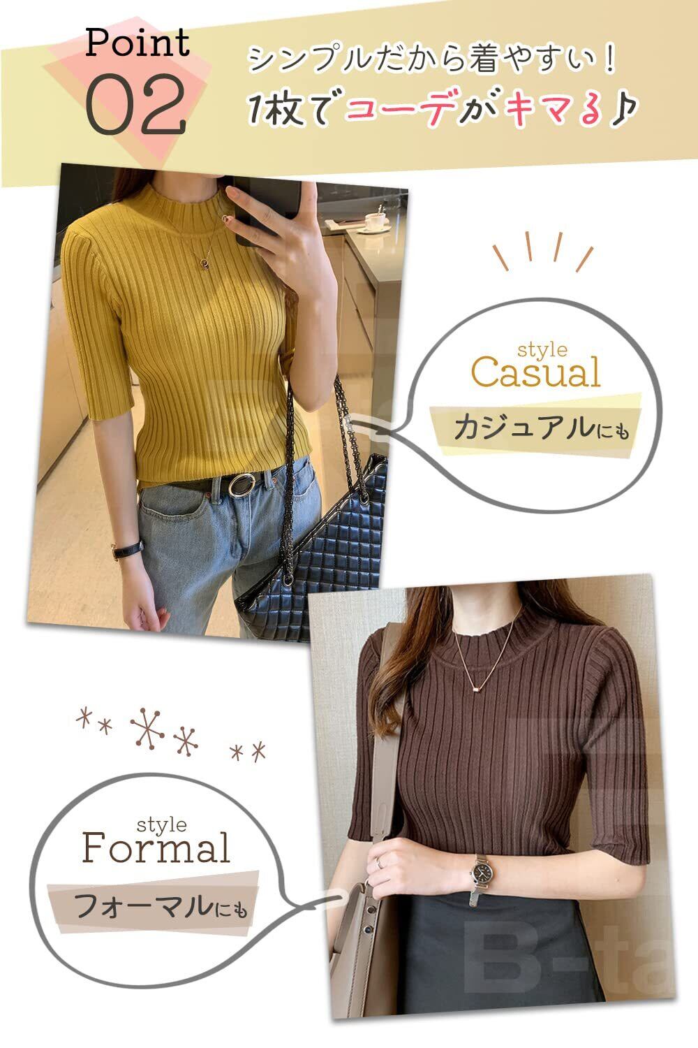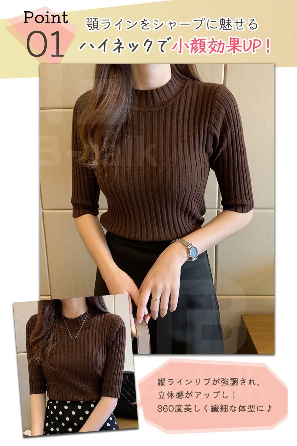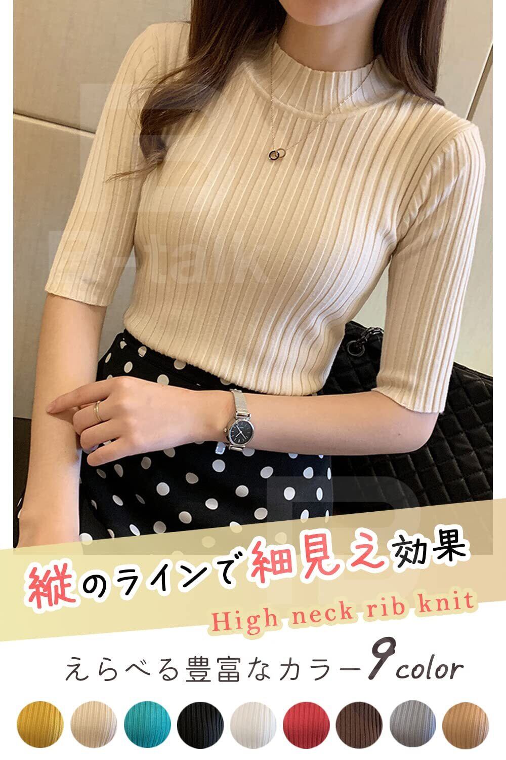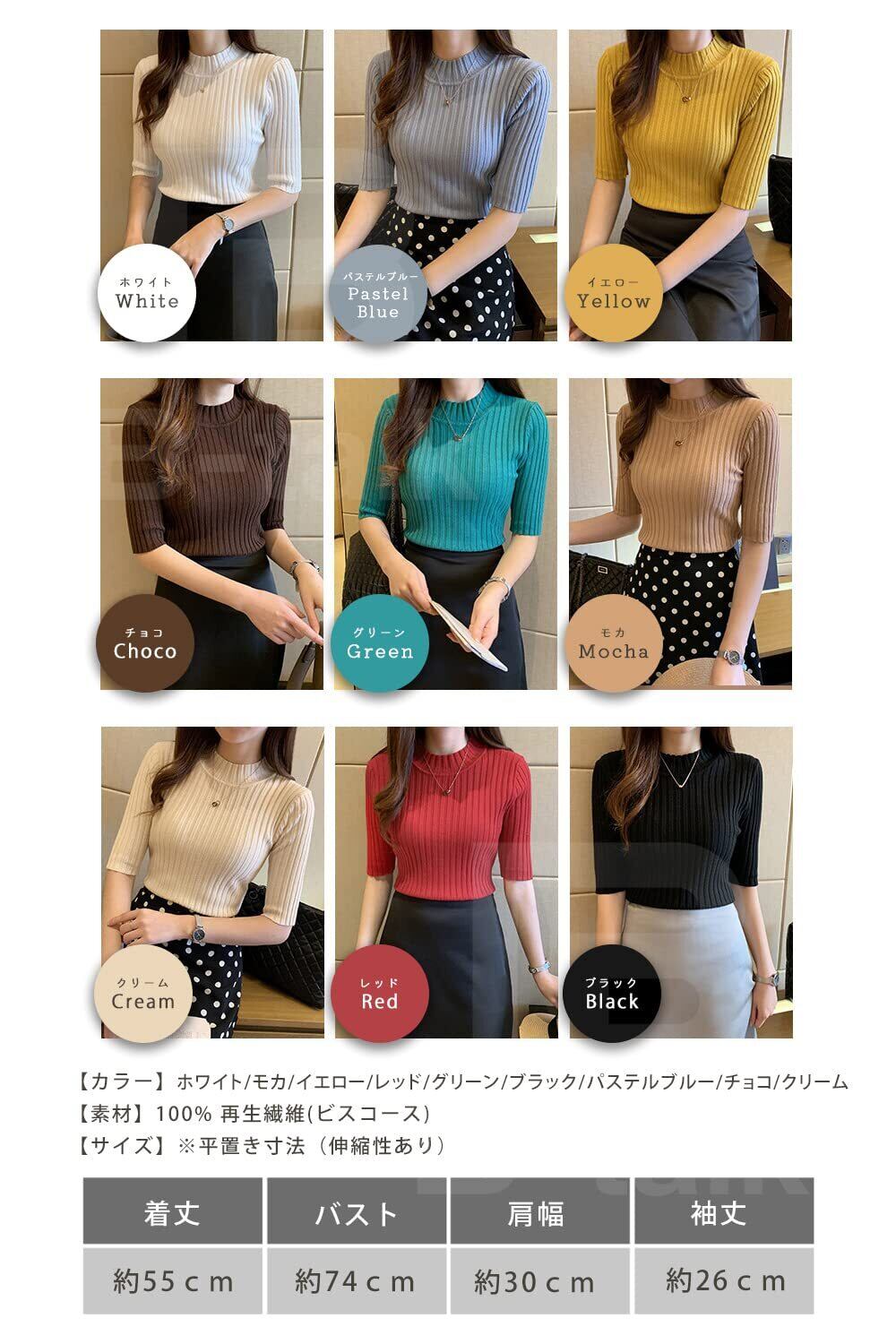 [ビートーク] リブニット 五分袖 トップス ニットソー セーター ハイネック インナー レディース フリーサイズ