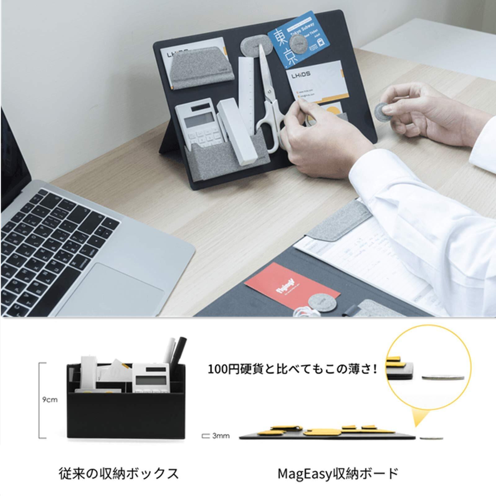 【リモートワーカー愛用!マグネットでスッキリ収納MagEasy磁気クリップボード】従来の収納ボックスとは違い、薄型で省スペースのため、机のスペースを確保したままでの収納が可能になります。折り紙からヒントを得た収納スタンドの設置は簡単、サッと広げて1秒で完了し、オリジナルのワークステーションを形成します。 NHKでも紹介されました。