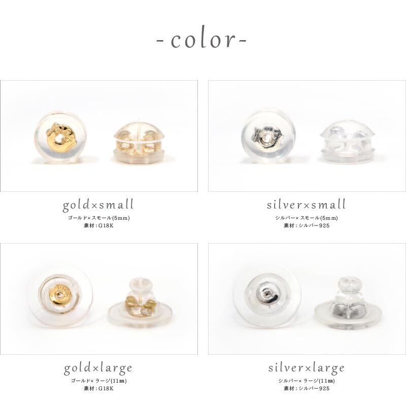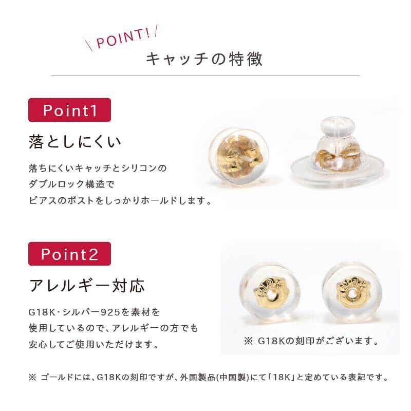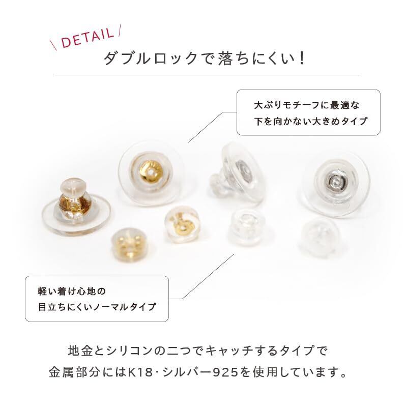 地金とシリコンの二つでキャッチするダブルロック式の落ちないピアスキャッチです。