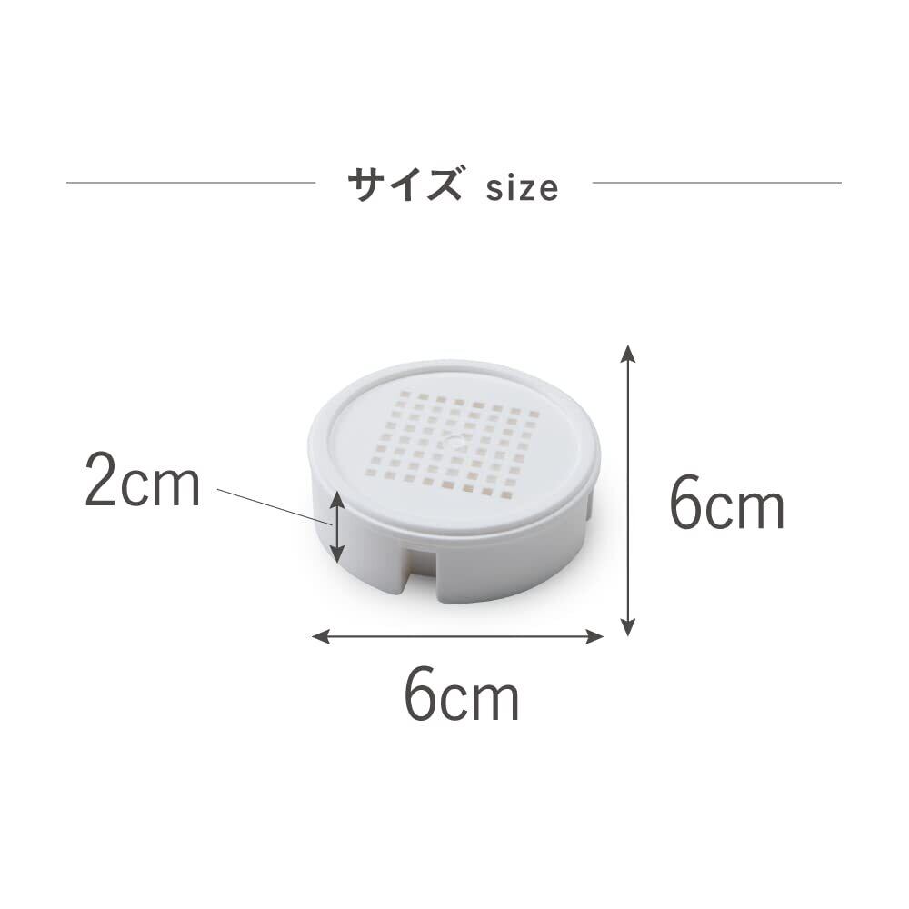 【商品仕様】サイズ:幅6×奥行2×高さ6cm、素材:ポリプロピレン、除去対象物:遊離残留塩素、総ろ過流量:2000L、交換期間の目安:約1ヶ月(1個あたり)、ろ材の種類:亜硫酸カルシウム、ろ過流量:8L/min、使用水圧:0.07~0.4Mpa、日本製
