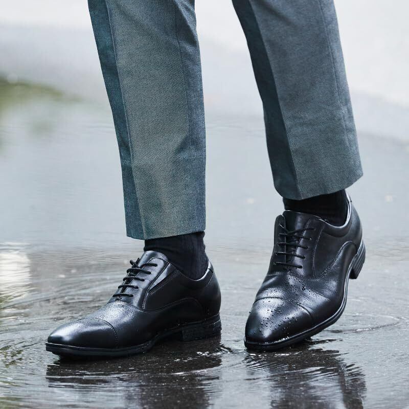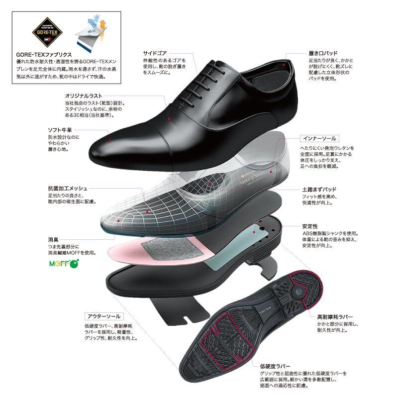 【GORE-TEX】 タフに使える全天候型ビジネスシューズ。ゴアテックスメンブレン採用:透湿防水性素材をライニング材に使用し、じめじめした雨の日のストレスを軽減します。幅広3E相当/クッション性と屈曲性に優れ、軽量感のあるE.V.A.インジェクションソール採用/踏みつけ部に「低硬度ラバー」、かかと部に「高耐摩耗ラバー」を採用し、凹凸感のある意匠にてグリップ性と耐久性を考慮/インナーソールつま先部に消臭繊維「MOFF」、インナーソール表面に抗菌繊維を採用(JIS L1902:菌液吸収法)/足当たりのやわらかく、へたりにくい中敷きを採用し、歩行時の耐圧を足裏全体で支持/土ふまず部分にフィットするパッド/足首をやさしく包み込む履き口スポンジパッド/ベロ裏クッションを採用し、足の甲部にやさしくフィット/履き口(内側)にゴアを使用し、脱ぎ履きが快適な仕様。