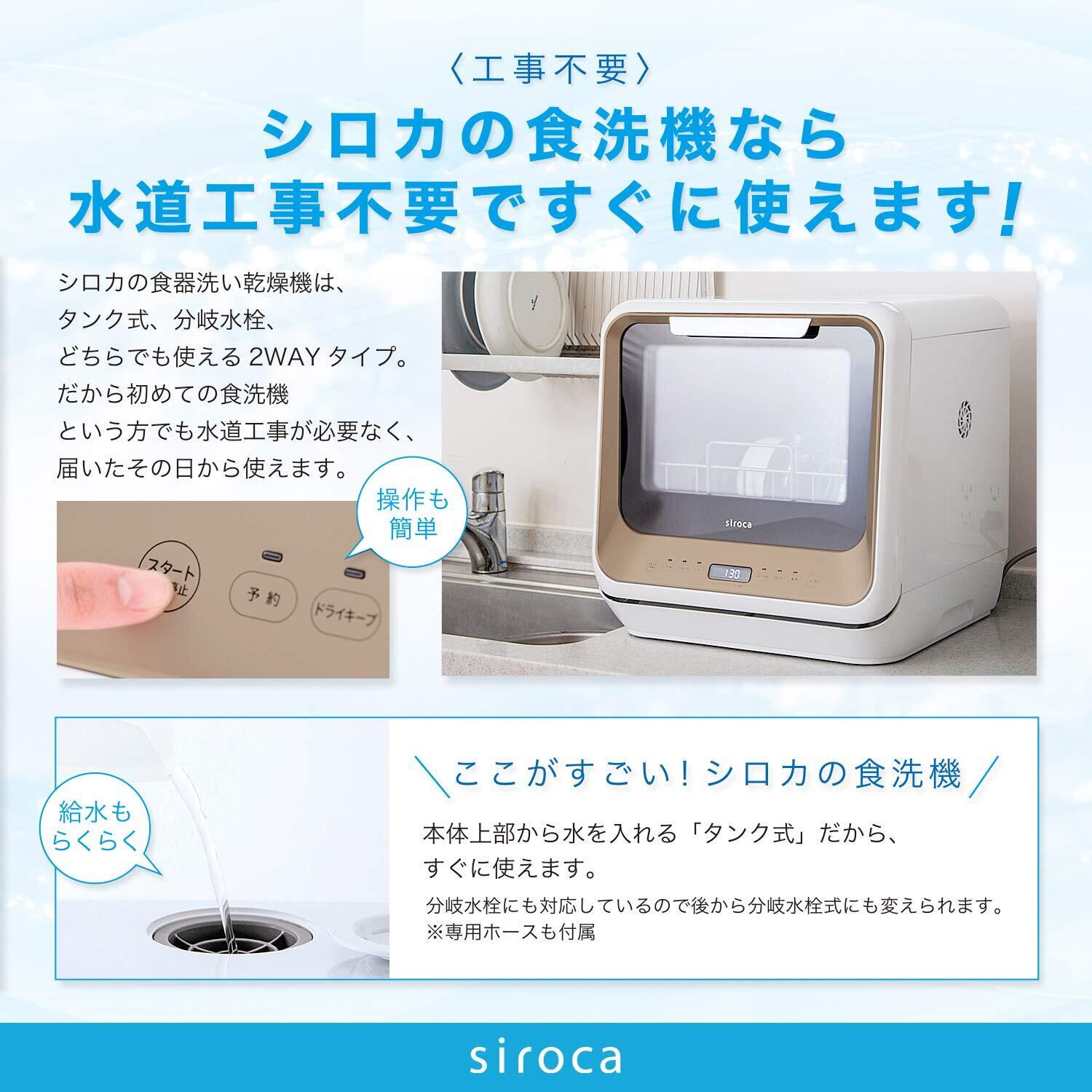シロカ 2WAY食器洗い乾燥機 [食洗機/工事不要/分岐水栓対応/液晶表示付き/タイマー搭載/360℃キレイウォッシュ] PDW-5D (ゴールド)