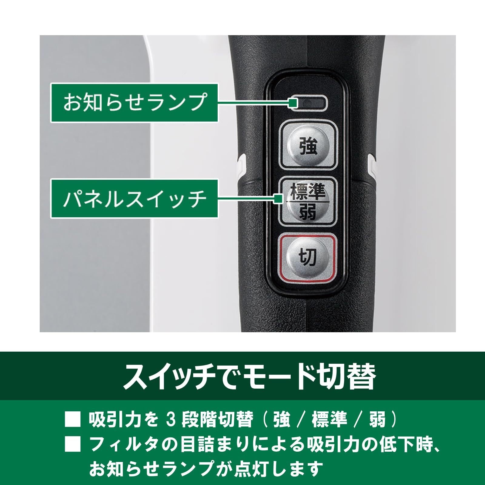 ●お知らせランプ搭載。フィルタの目詰まりによる吸込力の低下をランプでお知らせします。また、じゅうたんやカーテンなどの吸い付きにより吸込口がふさがれた場合にも、同様にランプでお知らせします。同時に、モーターや蓄電池保護のため自動的に保護運転(低速状態 )に切替わります。