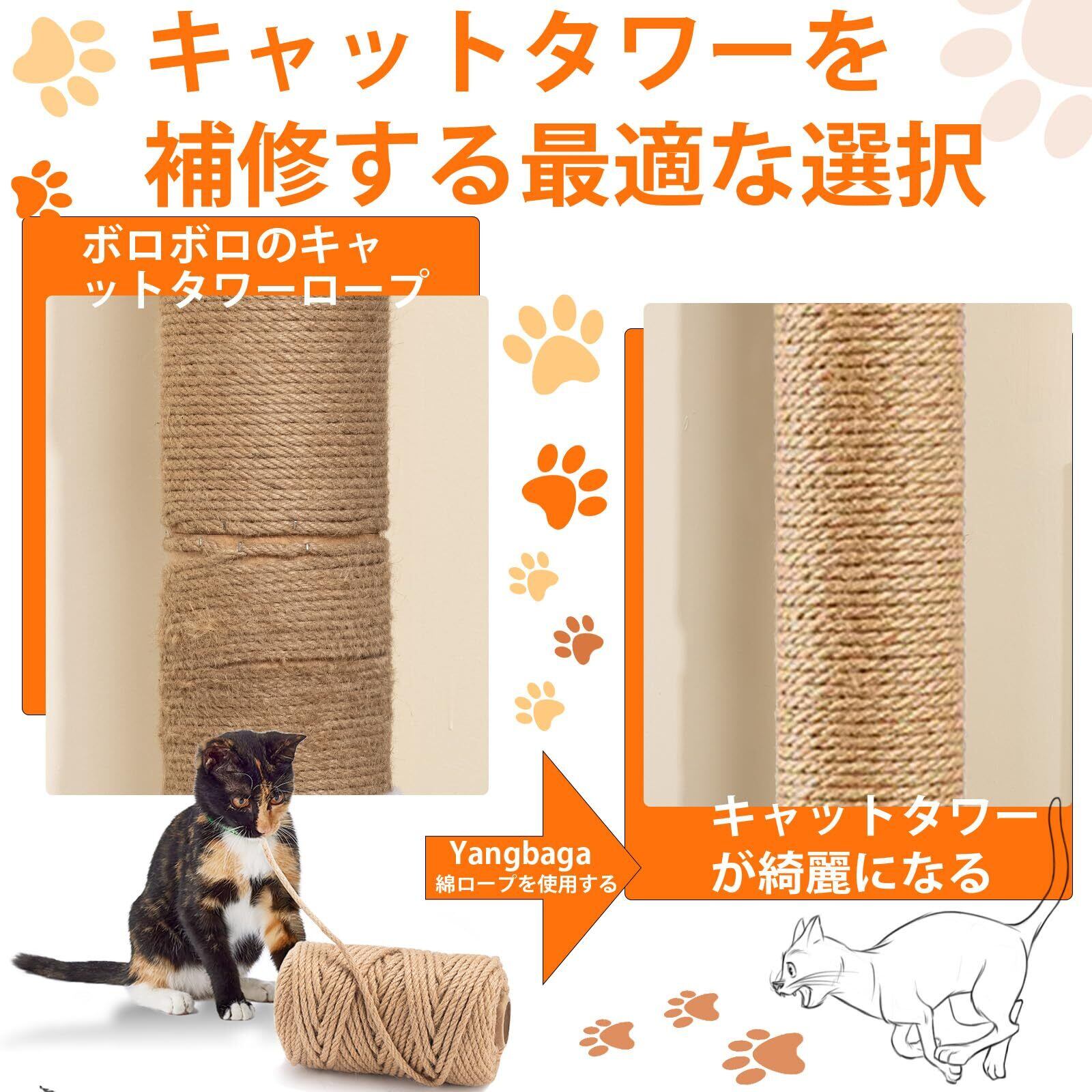 麻ロープ6mmYangbaga麻縄 猫 爪とぎ 麻紐 ジュートロープ 爪とぎ 爪を磨き キャットタワー用 キャットクライミングフレームの修理の代替品 手作り DIY 園芸 ボールが 含まれています(100M)
