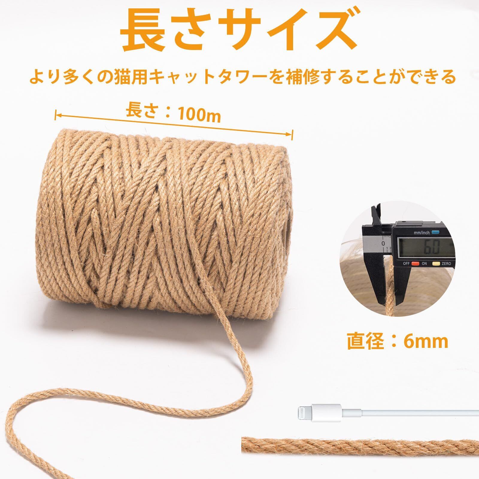 サイズ:麻ロープは直径(太さは):6mm、長さは100m。