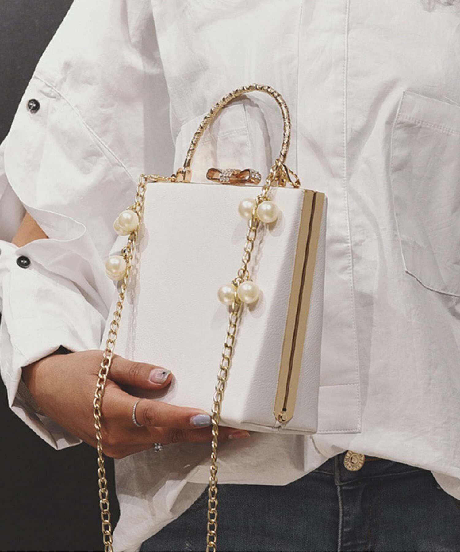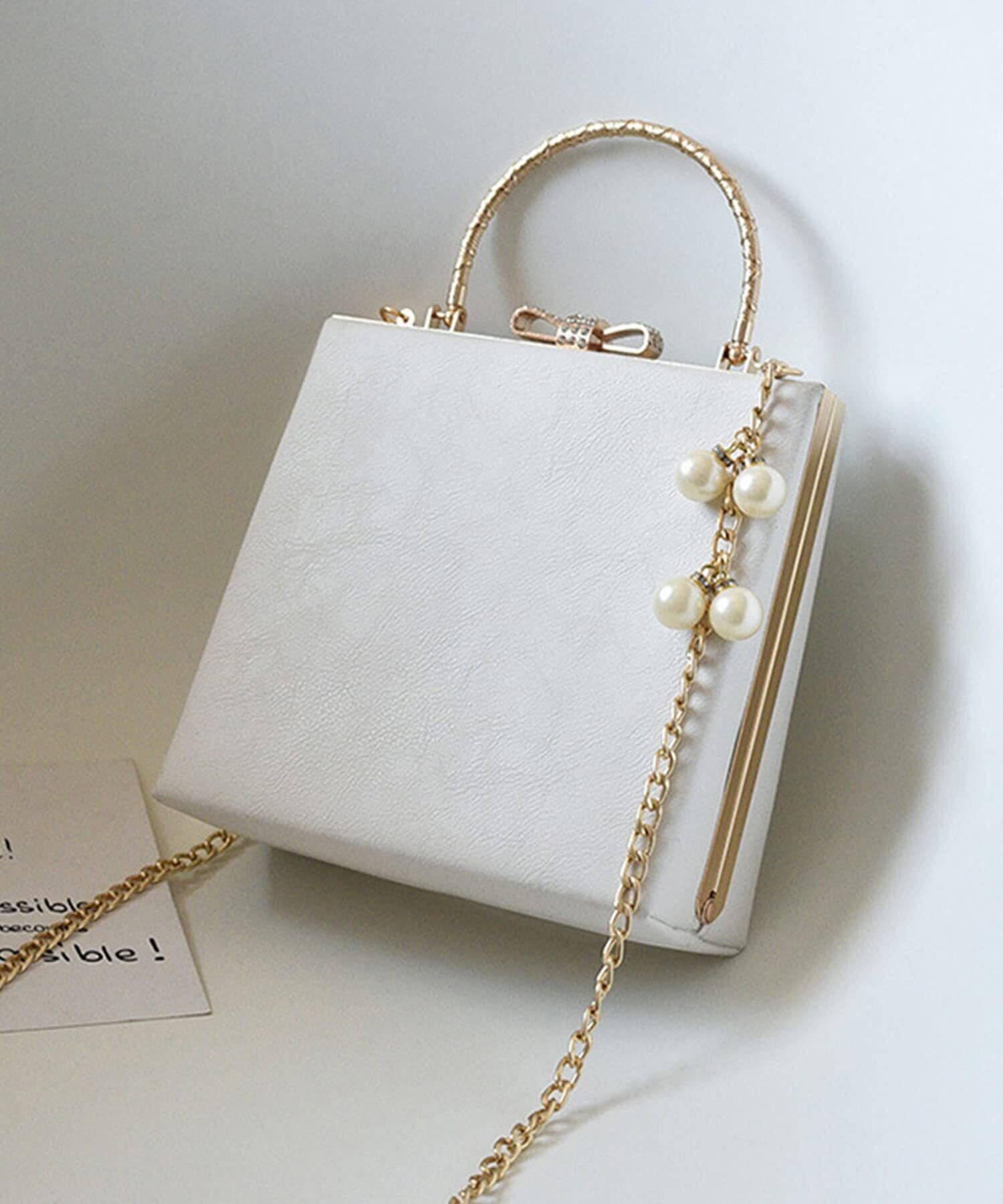 パール付きのチェーンは取り外し可能です。マグネット開封式、内ポケット3つ。 色味も落ち着いているので普段使いもパーディーにも!