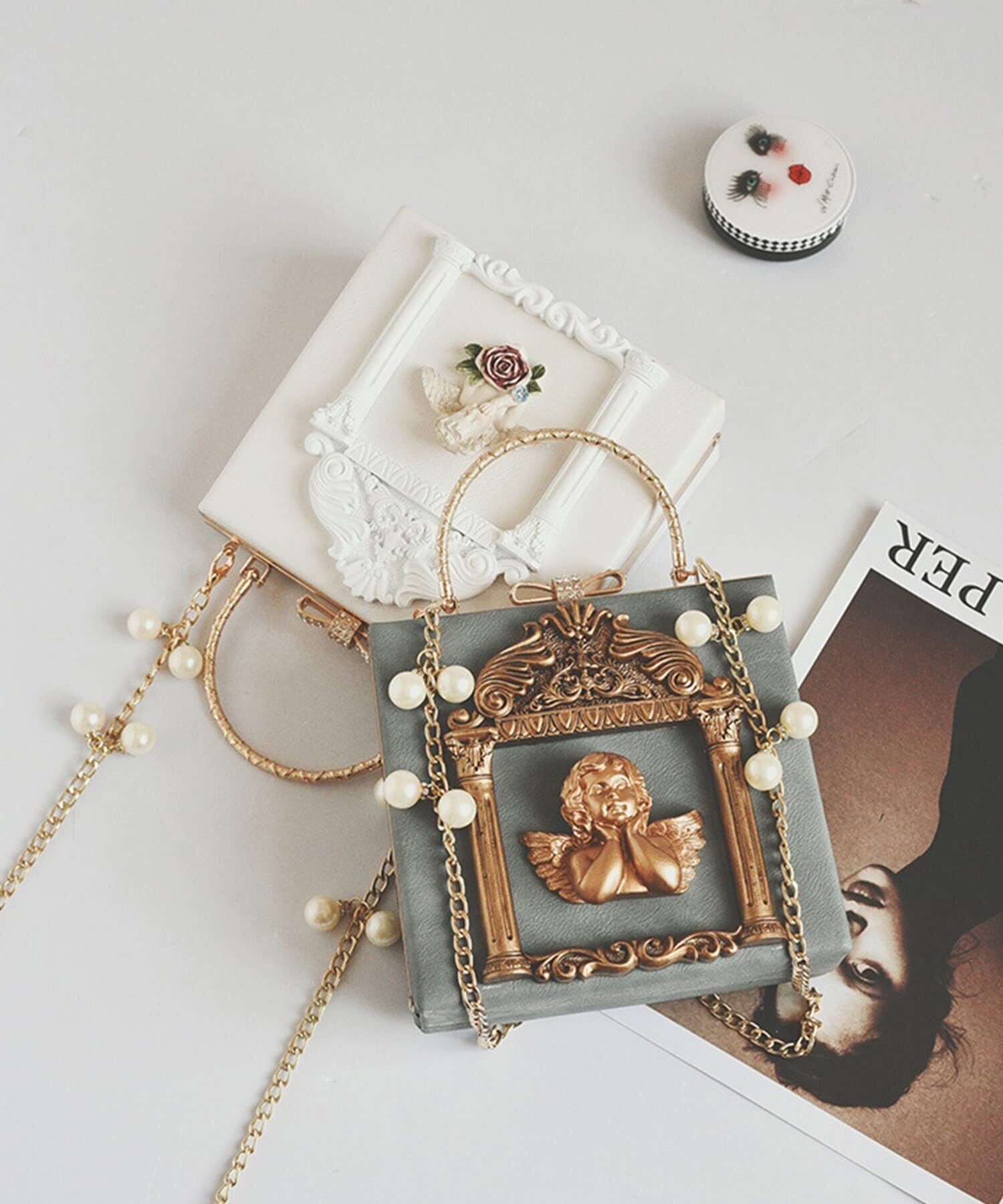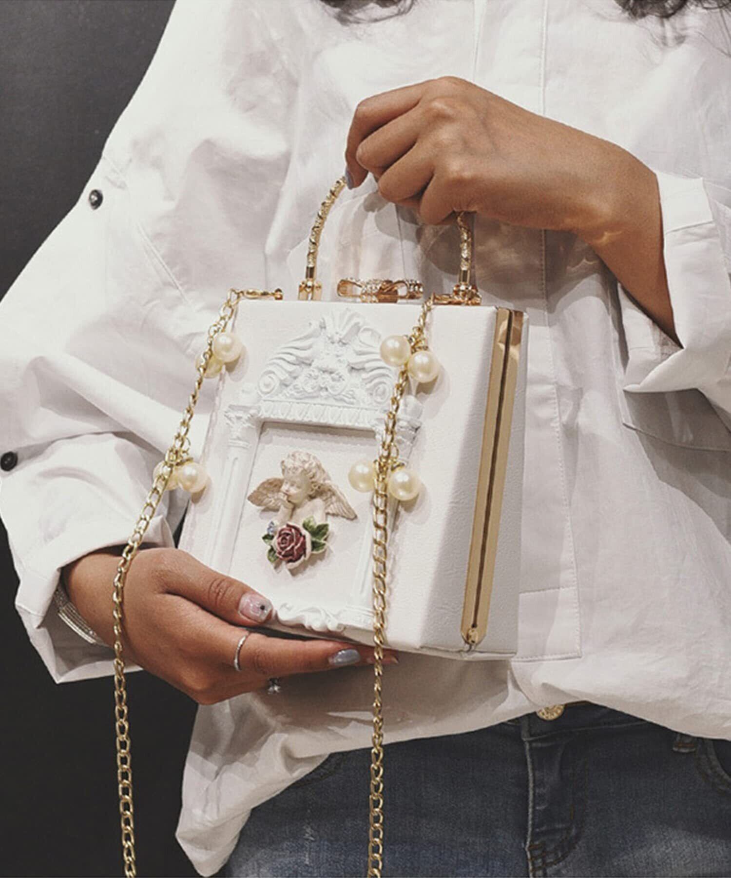 チェーンがエレガントで上品な印象のハンドバッグ。 レトロ天使の立体的なレリーフが印象的な ジーンズなどに合わせてもおしゃれなエンジェルのミニ ハンドバッグです!