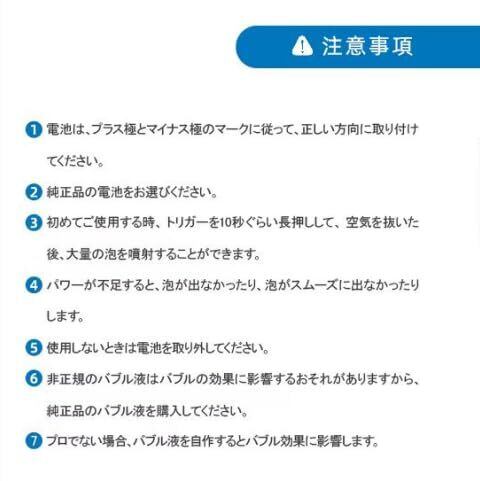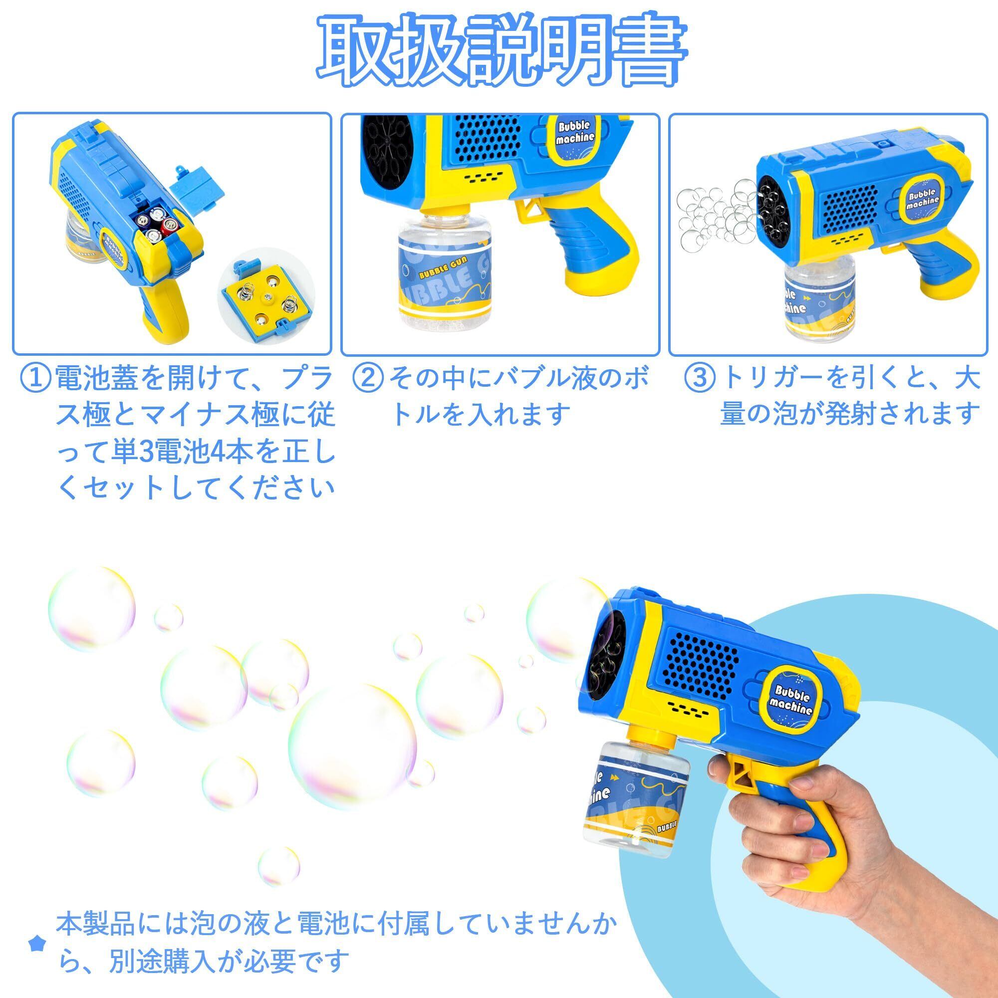 銃本体は、正極と負極に従って4本の単三電池を正しく入れる必要があります。本製品には、バブルガン本体、バブル液ボトルが含まれています。電池、シャボン玉液は付属していません(別途ご購入ください)。対象年齢:6歳以上。