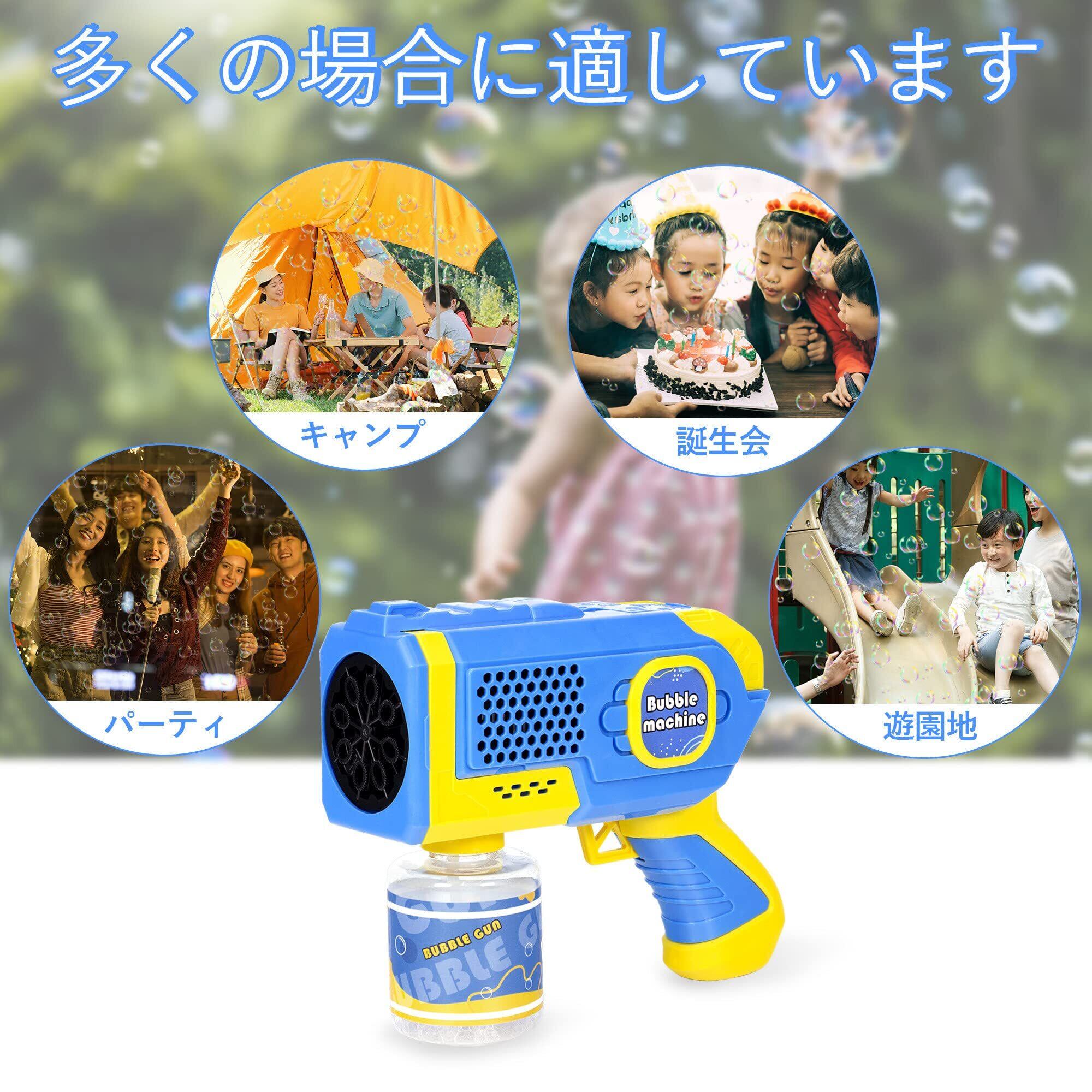 8つのバブルホールがありますから、一度に多くのバブルを発射できて、銃のLEDライトはまばゆい光があります。お子様が楽しく遊べます。これはお子様のおもちゃとしてだけでなく、パーティーや野外イベントでのパフォーマンスのツールとしてもお使いいただけます。