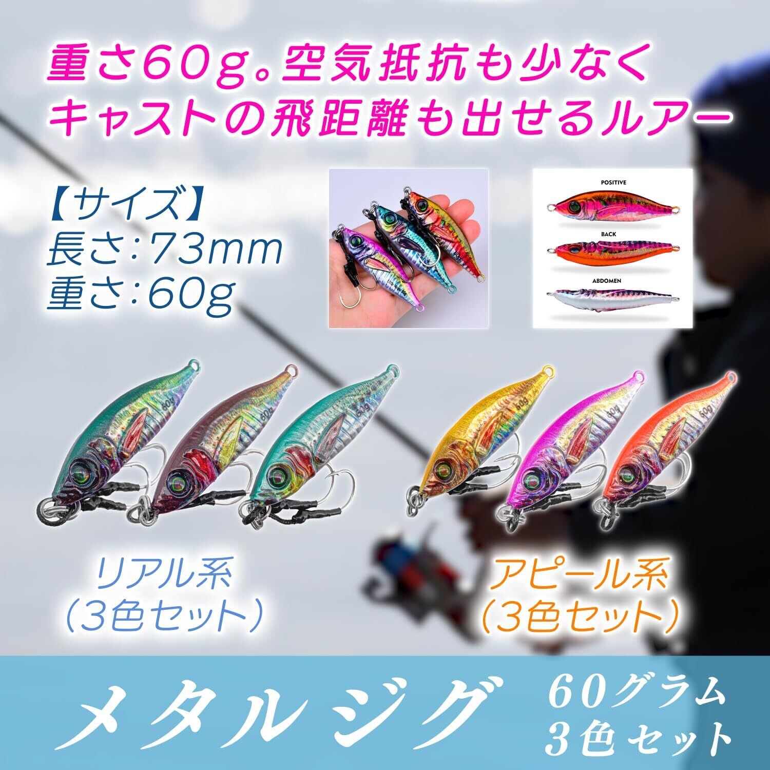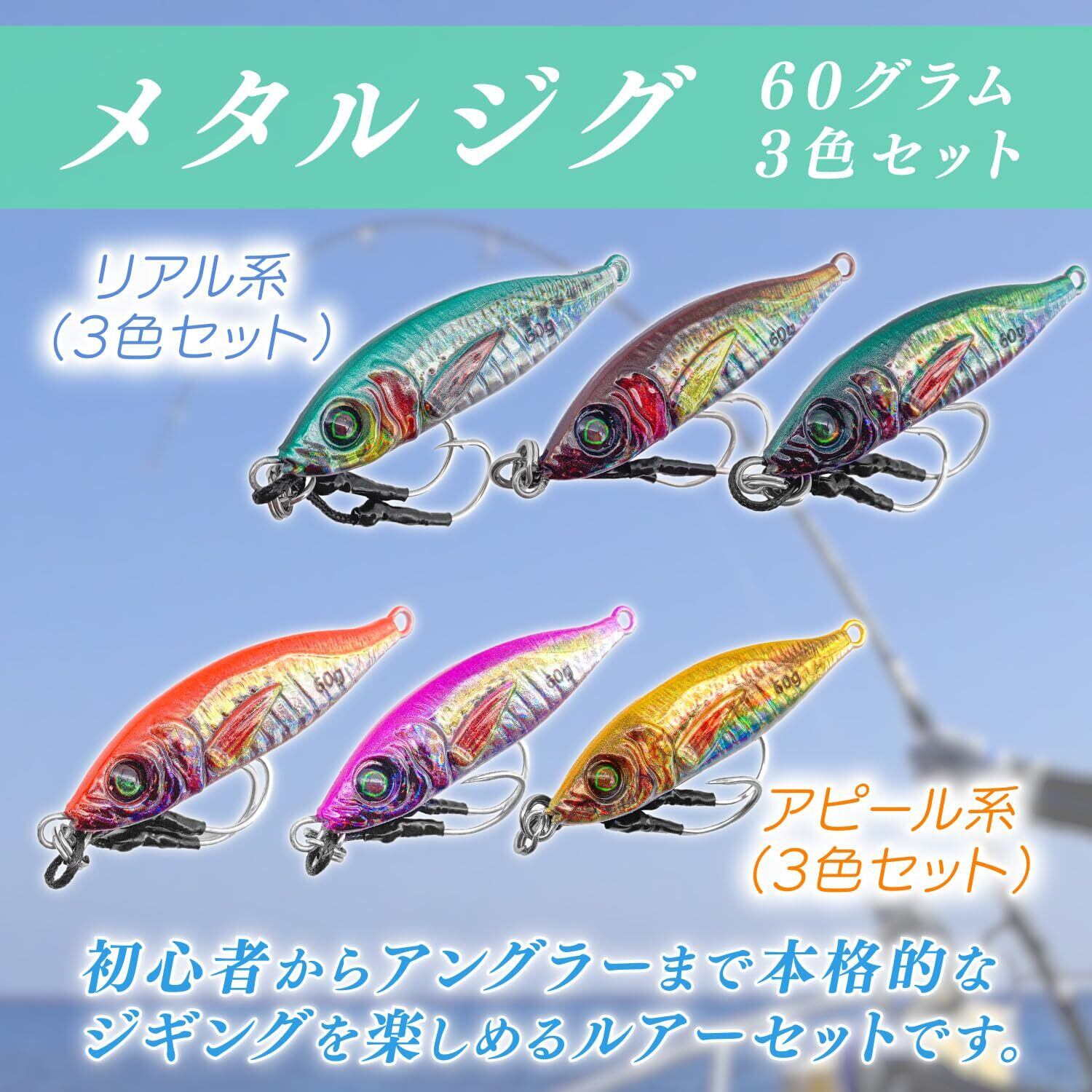 キラキラとした反射が魚を引き寄せるメタルジグです。カラーは本物とそっくりな「リアル系3色セット」と、目立つ「アピール系3色セット」の選べる2タイプをご用意させていただきました。天候、季節、時間、水の濁り具合などに応じた、カラーチョイスでヒット率UP。 ボディの曲線デザインがリアルな動きを再現し、ヒラヒラとフォールして魚にアピールします。また、キャスト時の空気抵抗も少なく狙ったポイントまで飛距離を出せるルアーです。 ショアからの太刀魚や青物、サーブからキャスティングでのヒラメ狙い、河口付近のシーバスなどなど多彩な魚種が狙え、初心者から本格アングラーまでジギングゲームを楽しめるメタルジグセットです。 フックは鋭く頑丈で貫通力がありHITした魚を逃しません。ナイトゲーム等の暗闇ではグリーンに発光し抜群のアピール力。 ■サイズ 長さ約73mm 重さ60g