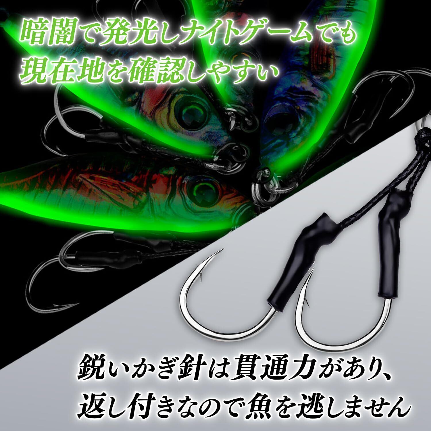 フックは鋭く頑丈で貫通力がありHITした魚を逃しません。ナイトゲーム等の暗闇ではグリーンに発光し抜群のアピール力。
