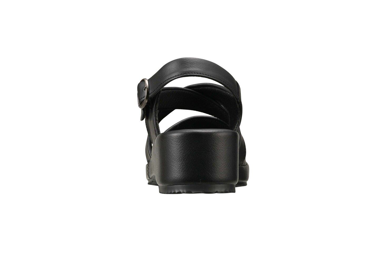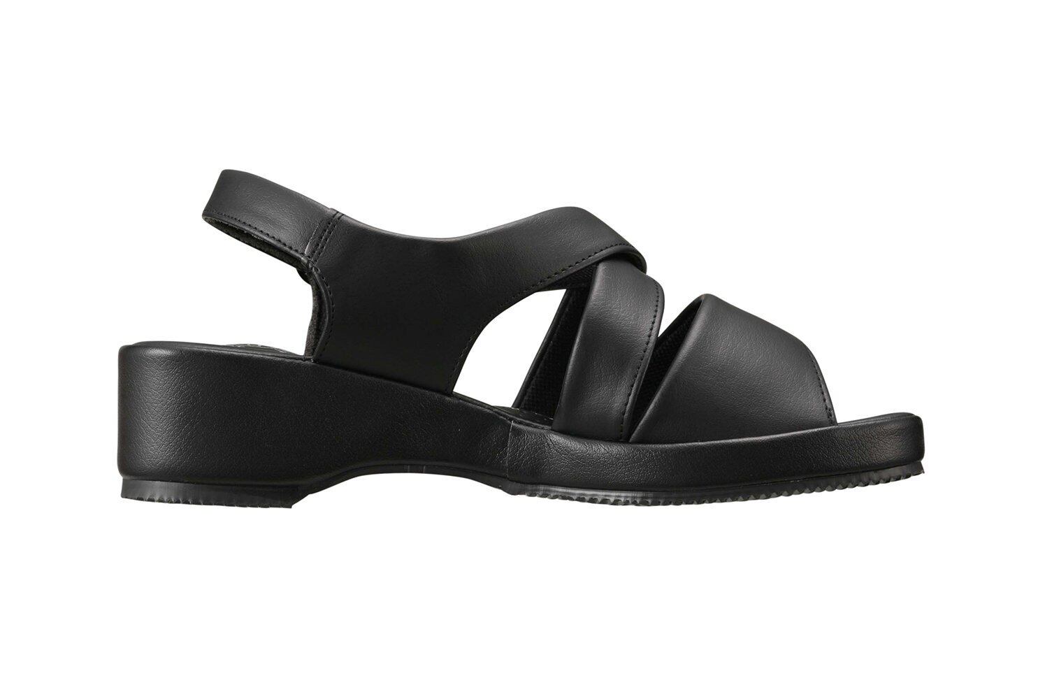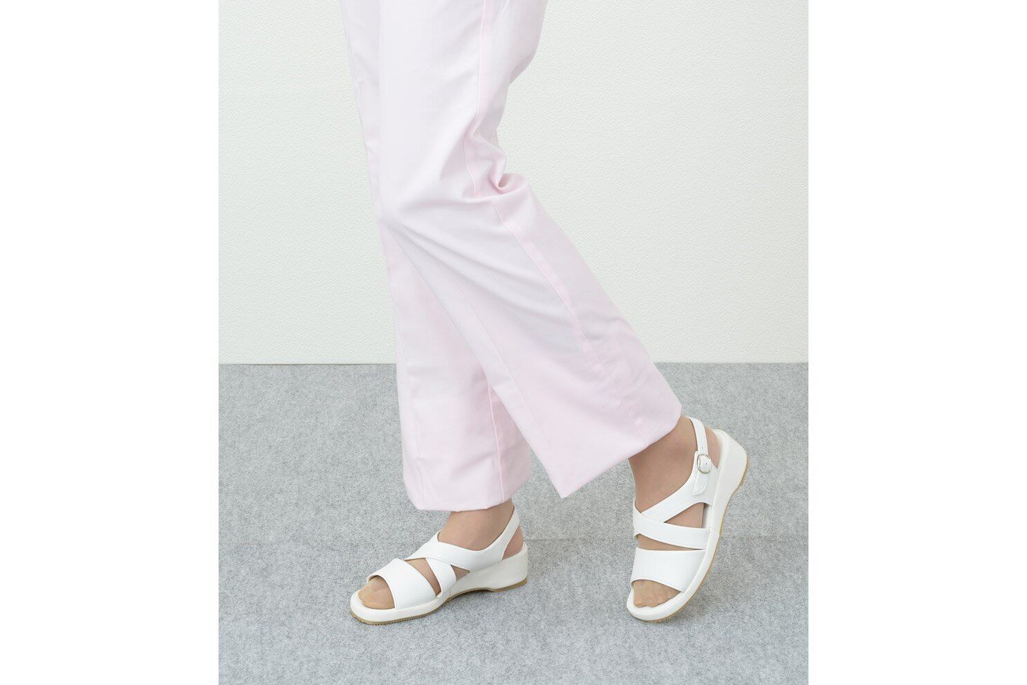 クロスバンドが足を入れやすく、バックベルト部分のゴムにより脱ぎ履きラクラク。ナースサンダルにも最適。