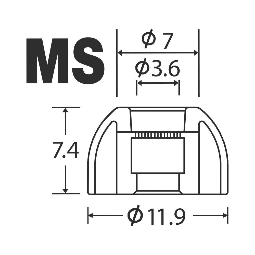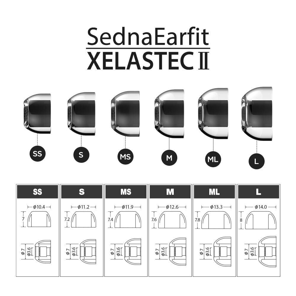 【より多くの方にベストフィッティングさせる6サイズ展開】SednaEarfit XELASTEC IIは、一般サイズのStandardタイプを採用しています。中間サイズを含めたSS/S/MS/M/ML/Lの計6サイズで、より多くの方にフィッティングしやすくしています。また、パッケージング構成は、単品サイズ2ペアと、非常に好評な中間サイズを含めた近接3サイズ(例:S/MS/M)を1ペアずつパッケージングした3ペアの2種類を採用。これにより、左右で耳道の大きさが異なるなどの際、微妙な調整をしやすくなります。さらに最もユーザーニーズが高かった近隣3サイズのMサイズクラスは、MとMSそれぞれを中心にした2タイプのセット商品をご用意し、より選択しやすいようにしました。