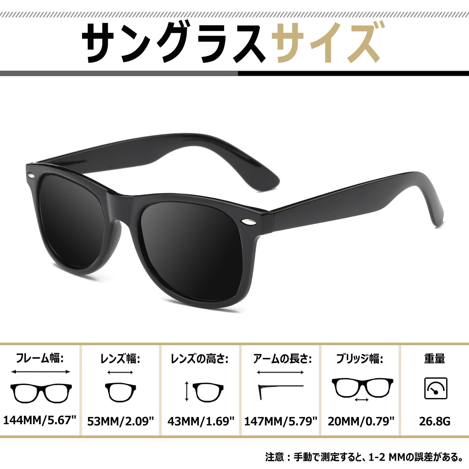 【商品仕様】フレーム幅:144㎜;レンズ幅:53㎜;ブリッジ:20㎜;テンプル長さ:147㎜;重量:26.8g;レンズ種類:TAC偏光レンズ。レトロのブラックサングラスわせはミステリアスでクールな印象を演出してくれ、普段使いをもちろん、ウォーキング、ハイキング、スポーツ 、運転、旅行、 バイク、登山、釣り、スキーなど様々なシーンに大活躍してくれます